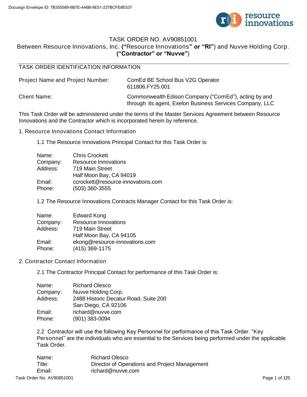 Task Order No. AV90851001 Page 1 of 125 TASK ORDER NO. AV90851001 Between Resource Innovations, Inc. (“Resource Innovations” or “RI”) and Nuvve Holding Corp. (“Contractor” or “Nuvve”) TASK ORDER IDENTIFICATION INFORMATION Project Name and Project Number: ComEd BE School Bus V2G Operator 611806.FY25.001 Client Name: Commonwealth Edison Company (“ComEd”), acting by and through its agent, Exelon Business Services Company, LLC This Task Order will be administered under the terms of the Master Services Agreement between Resource Innovations and the Contractor which is incorporated herein by reference. 1. Resource Innovations Contact Information 1.1 The Resource Innovations Principal Contact for this Task Order is: Name: Chris Crockett Company: Resource Innovations Address: 719 Main Street Half Moon Bay, CA 94019 Email: ccrockett@resource-innovations.com Phone: (503) 360-3555 1.2 The Resource Innovations Contracts Manager Contact for this Task Order is: Name: Edward Kong Company: Resource Innovations Address: 719 Main Street Half Moon Bay, CA 94105 Email: ekong@resource-innovations.com Phone: (415) 369-1175 2. Contractor Contact Information 2.1 The Contractor Principal Contact for performance of this Task Order is: Name: Richard Olesco Company: Nuvve Holding Corp. Address: 2488 Historic Decatur Road, Suite 200 San Diego, CA 92106 Email: richard@nuvve.com Phone: (901) 383-0094 2.2 Contractor will use the following Key Personnel for performance of this Task Order. “Key Personnel” are the individuals who are essential to the Services being performed under the applicable Task Order. Name: Richard Olesco Title: Director of Operations and Project Management Email: richard@nuvve.com Docusign Envelope ID: 7B355589-6B7E-4A6B-8E51-237BCFE8E537