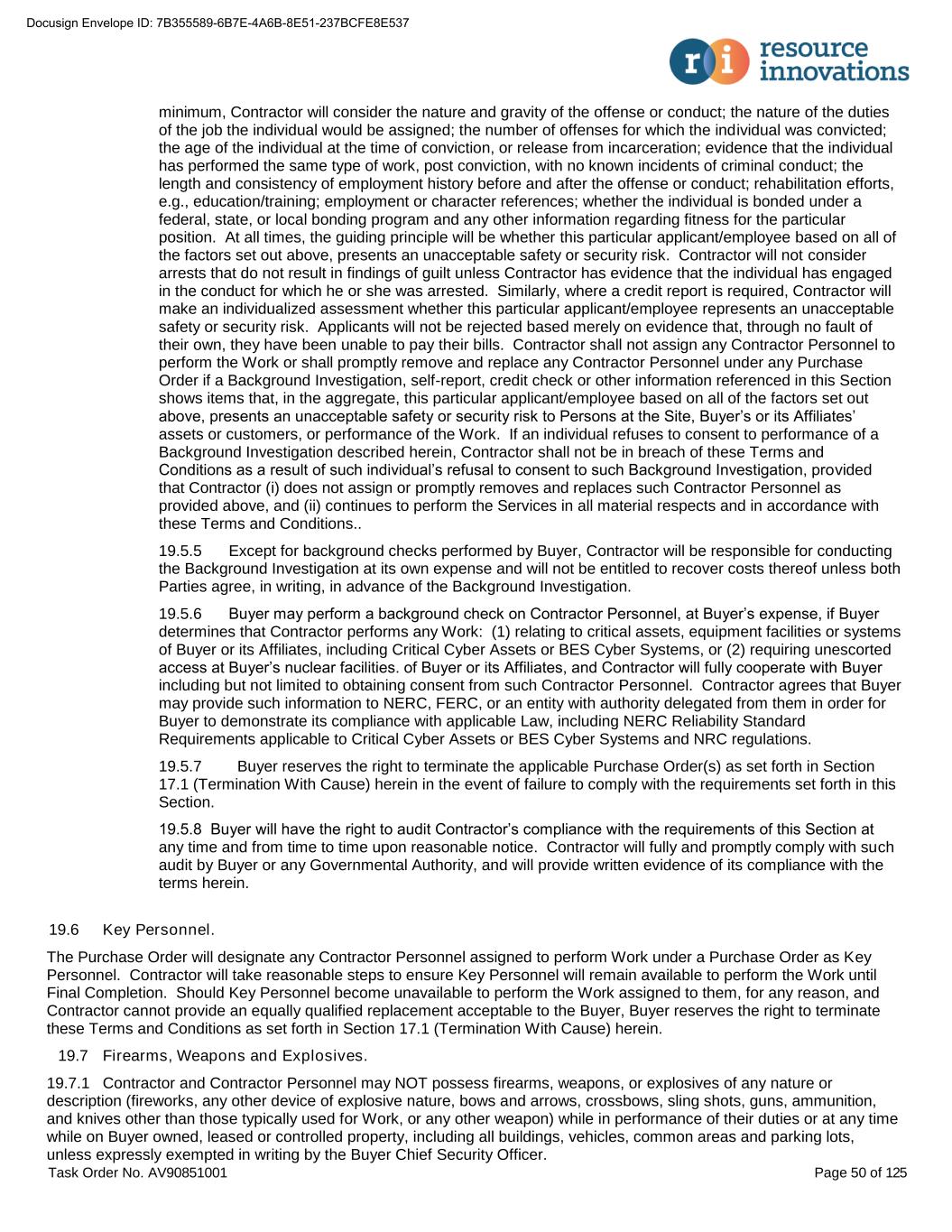 Task Order No. AV90851001 Page 50 of 125 minimum, Contractor will consider the nature and gravity of the offense or conduct; the nature of the duties of the job the individual would be assigned; the number of offenses for which the individual was convicted; the age of the individual at the time of conviction, or release from incarceration; evidence that the individual has performed the same type of work, post conviction, with no known incidents of criminal conduct; the length and consistency of employment history before and after the offense or conduct; rehabilitation efforts, e.g., education/training; employment or character references; whether the individual is bonded under a federal, state, or local bonding program and any other information regarding fitness for the particular position. At all times, the guiding principle will be whether this particular applicant/employee based on all of the factors set out above, presents an unacceptable safety or security risk. Contractor will not consider arrests that do not result in findings of guilt unless Contractor has evidence that the individual has engaged in the conduct for which he or she was arrested. Similarly, where a credit report is required, Contractor will make an individualized assessment whether this particular applicant/employee represents an unacceptable safety or security risk. Applicants will not be rejected based merely on evidence that, through no fault of their own, they have been unable to pay their bills. Contractor shall not assign any Contractor Personnel to perform the Work or shall promptly remove and replace any Contractor Personnel under any Purchase Order if a Background Investigation, self-report, credit check or other information referenced in this Section shows items that, in the aggregate, this particular applicant/employee based on all of the factors set out above, presents an unacceptable safety or security risk to Persons at the Site, Buyer’s or its Affiliates’ assets or customers, or performance of the Work. If an individual refuses to consent to performance of a Background Investigation described herein, Contractor shall not be in breach of these Terms and Conditions as a result of such individual’s refusal to consent to such Background Investigation, provided that Contractor (i) does not assign or promptly removes and replaces such Contractor Personnel as provided above, and (ii) continues to perform the Services in all material respects and in accordance with these Terms and Conditions.. 19.5.5 Except for background checks performed by Buyer, Contractor will be responsible for conducting the Background Investigation at its own expense and will not be entitled to recover costs thereof unless both Parties agree, in writing, in advance of the Background Investigation. 19.5.6 Buyer may perform a background check on Contractor Personnel, at Buyer’s expense, if Buyer determines that Contractor performs any Work: (1) relating to critical assets, equipment facilities or systems of Buyer or its Affiliates, including Critical Cyber Assets or BES Cyber Systems, or (2) requiring unescorted access at Buyer’s nuclear facilities. of Buyer or its Affiliates, and Contractor will fully cooperate with Buyer including but not limited to obtaining consent from such Contractor Personnel. Contractor agrees that Buyer may provide such information to NERC, FERC, or an entity with authority delegated from them in order for Buyer to demonstrate its compliance with applicable Law, including NERC Reliability Standard Requirements applicable to Critical Cyber Assets or BES Cyber Systems and NRC regulations. 19.5.7 Buyer reserves the right to terminate the applicable Purchase Order(s) as set forth in Section 17.1 (Termination With Cause) herein in the event of failure to comply with the requirements set forth in this Section. 19.5.8 Buyer will have the right to audit Contractor’s compliance with the requirements of this Section at any time and from time to time upon reasonable notice. Contractor will fully and promptly comply with such audit by Buyer or any Governmental Authority, and will provide written evidence of its compliance with the terms herein. 19.6 Key Personnel. The Purchase Order will designate any Contractor Personnel assigned to perform Work under a Purchase Order as Key Personnel. Contractor will take reasonable steps to ensure Key Personnel will remain available to perform the Work until Final Completion. Should Key Personnel become unavailable to perform the Work assigned to them, for any reason, and Contractor cannot provide an equally qualified replacement acceptable to the Buyer, Buyer reserves the right to terminate these Terms and Conditions as set forth in Section 17.1 (Termination With Cause) herein. 19.7 Firearms, Weapons and Explosives. 19.7.1 Contractor and Contractor Personnel may NOT possess firearms, weapons, or explosives of any nature or description (fireworks, any other device of explosive nature, bows and arrows, crossbows, sling shots, guns, ammunition, and knives other than those typically used for Work, or any other weapon) while in performance of their duties or at any time while on Buyer owned, leased or controlled property, including all buildings, vehicles, common areas and parking lots, unless expressly exempted in writing by the Buyer Chief Security Officer. Docusign Envelope ID: 7B355589-6B7E-4A6B-8E51-237BCFE8E537