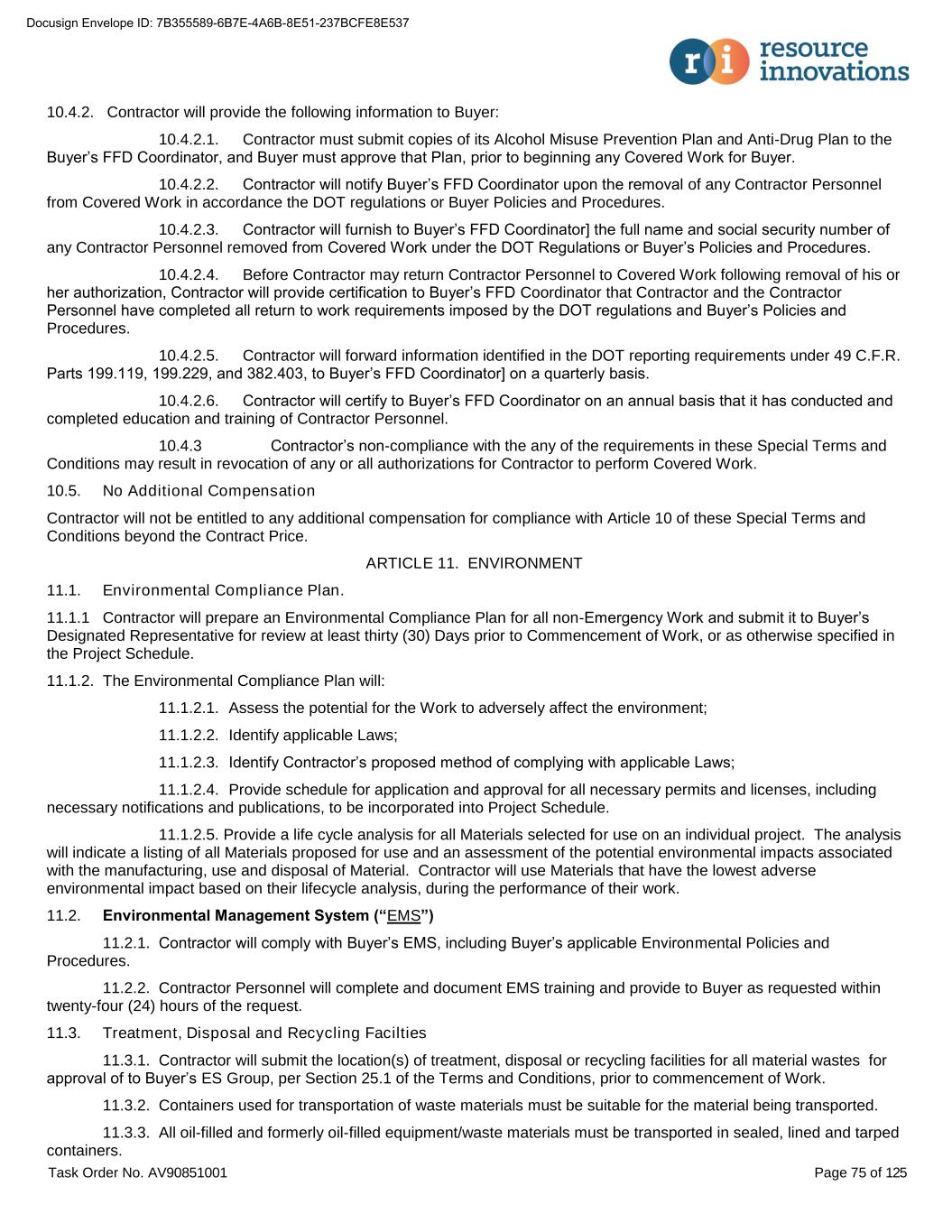 Task Order No. AV90851001 Page 75 of 125 10.4.2. Contractor will provide the following information to Buyer: 10.4.2.1. Contractor must submit copies of its Alcohol Misuse Prevention Plan and Anti-Drug Plan to the Buyer’s FFD Coordinator, and Buyer must approve that Plan, prior to beginning any Covered Work for Buyer. 10.4.2.2. Contractor will notify Buyer’s FFD Coordinator upon the removal of any Contractor Personnel from Covered Work in accordance the DOT regulations or Buyer Policies and Procedures. 10.4.2.3. Contractor will furnish to Buyer’s FFD Coordinator] the full name and social security number of any Contractor Personnel removed from Covered Work under the DOT Regulations or Buyer’s Policies and Procedures. 10.4.2.4. Before Contractor may return Contractor Personnel to Covered Work following removal of his or her authorization, Contractor will provide certification to Buyer’s FFD Coordinator that Contractor and the Contractor Personnel have completed all return to work requirements imposed by the DOT regulations and Buyer’s Policies and Procedures. 10.4.2.5. Contractor will forward information identified in the DOT reporting requirements under 49 C.F.R. Parts 199.119, 199.229, and 382.403, to Buyer’s FFD Coordinator] on a quarterly basis. 10.4.2.6. Contractor will certify to Buyer’s FFD Coordinator on an annual basis that it has conducted and completed education and training of Contractor Personnel. 10.4.3 Contractor’s non-compliance with the any of the requirements in these Special Terms and Conditions may result in revocation of any or all authorizations for Contractor to perform Covered Work. 10.5. No Additional Compensation Contractor will not be entitled to any additional compensation for compliance with Article 10 of these Special Terms and Conditions beyond the Contract Price. ARTICLE 11. ENVIRONMENT 11.1. Environmental Compliance Plan. 11.1.1 Contractor will prepare an Environmental Compliance Plan for all non-Emergency Work and submit it to Buyer’s Designated Representative for review at least thirty (30) Days prior to Commencement of Work, or as otherwise specified in the Project Schedule. 11.1.2. The Environmental Compliance Plan will: 11.1.2.1. Assess the potential for the Work to adversely affect the environment; 11.1.2.2. Identify applicable Laws; 11.1.2.3. Identify Contractor’s proposed method of complying with applicable Laws; 11.1.2.4. Provide schedule for application and approval for all necessary permits and licenses, including necessary notifications and publications, to be incorporated into Project Schedule. 11.1.2.5. Provide a life cycle analysis for all Materials selected for use on an individual project. The analysis will indicate a listing of all Materials proposed for use and an assessment of the potential environmental impacts associated with the manufacturing, use and disposal of Material. Contractor will use Materials that have the lowest adverse environmental impact based on their lifecycle analysis, during the performance of their work. 11.2. Environmental Management System (“EMS”) 11.2.1. Contractor will comply with Buyer’s EMS, including Buyer’s applicable Environmental Policies and Procedures. 11.2.2. Contractor Personnel will complete and document EMS training and provide to Buyer as requested within twenty-four (24) hours of the request. 11.3. Treatment, Disposal and Recycling Facilties 11.3.1. Contractor will submit the location(s) of treatment, disposal or recycling facilities for all material wastes for approval of to Buyer’s ES Group, per Section 25.1 of the Terms and Conditions, prior to commencement of Work. 11.3.2. Containers used for transportation of waste materials must be suitable for the material being transported. 11.3.3. All oil-filled and formerly oil-filled equipment/waste materials must be transported in sealed, lined and tarped containers. Docusign Envelope ID: 7B355589-6B7E-4A6B-8E51-237BCFE8E537