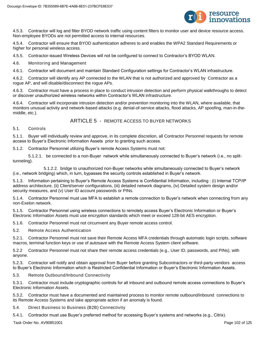 Task Order No. AV90851001 Page 102 of 125 4.5.3. Contractor will log and filter BYOD network traffic using content filters to monitor user and device resource access. Non-employee BYODs are not permitted access to internal resources. 4.5.4. Contractor will ensure that BYOD authentication adheres to and enables the WPA2 Standard Requirements or higher for personal wireless access. 4.5.5. Contractor-issued Wireless Devices will not be configured to connect to Contractor’s BYOD WLAN. 4.6. Monitoring and Management 4.6.1. Contractor will document and maintain Standard Configuration settings for Contractor’s WLAN infrastructure. 4.6.2. Contractor will identify any AP connected to the WLAN that is not authorized and approved by Contractor as a rogue AP, and will disable/disconnect the rogue APs. 4.6.3. Contractor must have a process in place to conduct intrusion detection and perform physical walkthroughs to detect or discover unauthorized wireless networks within Contractor’s WLAN infrastructure. 4.6.4. Contractor will incorporate intrusion detection and/or prevention monitoring into the WLAN, where available, that monitors unusual activity and network-based attacks (e.g. denial-of-service attacks, flood attacks, AP spoofing, man-in-the- middle, etc.). ARTICLE 5 - REMOTE ACCESS TO BUYER NETWORKS 5.1. Controls 5.1.1. Buyer will individually review and approve, in its complete discretion, all Contractor Personnel requests for remote access to Buyer’s Electronic Information Assets prior to granting such access. 5.1.2. Contractor Personnel utilizing Buyer’s remote Access Systems must not: 5.1.2.1. be connected to a non-Buyer network while simultaneously connected to Buyer’s network (i.e., no split- tunneling). 5.1.2.2. bridge to unauthorized non-Buyer networks while simultaneously connected to Buyer’s network (i.e., network bridging) which, in turn, bypasses the security controls established in Buyer’s network. 5.1.3. Information pertaining to Buyer’s Remote Access Systems is Confidential Information, including : (i) Internal TCP/IP address architecture, (ii) Client/server configurations, (iii) detailed network diagrams, (iv) Detailed system design and/or security measures, and (v) User ID account passwords or PINs. 5.1.4. Contractor Personnel must use MFA to establish a remote connection to Buyer’s network when connecting from any non-Exelon network. 5.1.5. Contractor Personnel using wireless connections to remotely access Buyer’s Electronic Information or Buyer’s Electronic Information Assets must use encryption standards which meet or exceed 128-bit AES encryption. 5.1.6. Contractor Personnel must not circumvent any Buyer remote access control. 5.2. Remote Access Authentication 5.2.1. Contractor Personnel must not save their Remote Access MFA credentials through automatic login scripts, software macros, terminal function keys or use of autosave with the Remote Access System client software. 5.2.2 Contractor Personnel must not share their remote access credentials (e.g., User ID, passwords, and PINs), with anyone. 5.2.3. Contractor will notify and obtain approval from Buyer before granting Subcontractors or third-party vendors access to Buyer’s Electronic Information which is Restricted Confidential Information or Buyer’s Electronic Information Assets. 5.3. Remote Outbound/Inbound Connectivity 5.3.1. Contractor must include cryptographic controls for all inbound and outbound remote access connections to Buyer’s Electronic Information Assets. 5.3.2. Contractor must have a documented and maintained process to monitor remote outbound/inbound connections to its Remote Access Systems and take appropriate action if an anomaly is found. 5.4. Direct Business to Business (B2B) Connectivity 5.4.1. Contractor must use Buyer’s preferred method for accessing Buyer’s systems and networks (e.g., Citrix). Docusign Envelope ID: 7B355589-6B7E-4A6B-8E51-237BCFE8E537