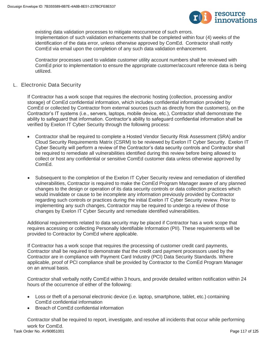 Task Order No. AV90851001 Page 117 of 125 existing data validation processes to mitigate reoccurrence of such errors. Implementation of such validation enhancements shall be completed within four (4) weeks of the identification of the data error, unless otherwise approved by ComEd. Contractor shall notify ComEd via email upon the completion of any such data validation enhancement. Contractor processes used to validate customer utility account numbers shall be reviewed with ComEd prior to implementation to ensure the appropriate customer/account reference data is being utilized. L. Electronic Data Security If Contractor has a work scope that requires the electronic hosting (collection, processing and/or storage) of ComEd confidential information, which includes confidential information provided by ComEd or collected by Contractor from external sources (such as directly from the customers), on the Contractor’s IT systems (i.e., servers, laptops, mobile device, etc.), Contractor shall demonstrate the ability to safeguard that information. Contractor’s ability to safeguard confidential information shall be verified by Exelon IT Cyber Security through the following process: Contractor shall be required to complete a Hosted Vendor Security Risk Assessment (SRA) and/or Cloud Security Requirements Matrix (CSRM) to be reviewed by Exelon IT Cyber Security. Exelon IT Cyber Security will perform a review of the Contractor’s data security controls and Contractor shall be required to remediate all vulnerabilities identified during this review before being allowed to collect or host any confidential or sensitive ComEd customer data unless otherwise approved by ComEd. Subsequent to the completion of the Exelon IT Cyber Security review and remediation of identified vulnerabilities, Contractor is required to make the ComEd Program Manager aware of any planned changes to the design or operation of its data security controls or data collection practices which would invalidate or cause to be incomplete any information previously provided by Contractor regarding such controls or practices during the initial Exelon IT Cyber Security review. Prior to implementing any such changes, Contractor may be required to undergo a review of those changes by Exelon IT Cyber Security and remediate identified vulnerabilities. Additional requirements related to data security may be placed if Contractor has a work scope that requires accessing or collecting Personally Identifiable Information (PII). These requirements will be provided to Contractor by ComEd where applicable. If Contractor has a work scope that requires the processing of customer credit card payments, Contractor shall be required to demonstrate that the credit card payment processors used by the Contractor are in compliance with Payment Card Industry (PCI) Data Security Standards. Where applicable, proof of PCI compliance shall be provided by Contractor to the ComEd Program Manager on an annual basis. Contractor shall verbally notify ComEd within 3 hours, and provide detailed written notification within 24 hours of the occurrence of either of the following: Loss or theft of a personal electronic device (i.e. laptop, smartphone, tablet, etc.) containing ComEd confidential information Breach of ComEd confidential information Contractor shall be required to report, investigate, and resolve all incidents that occur while performing work for ComEd. Docusign Envelope ID: 7B355589-6B7E-4A6B-8E51-237BCFE8E537