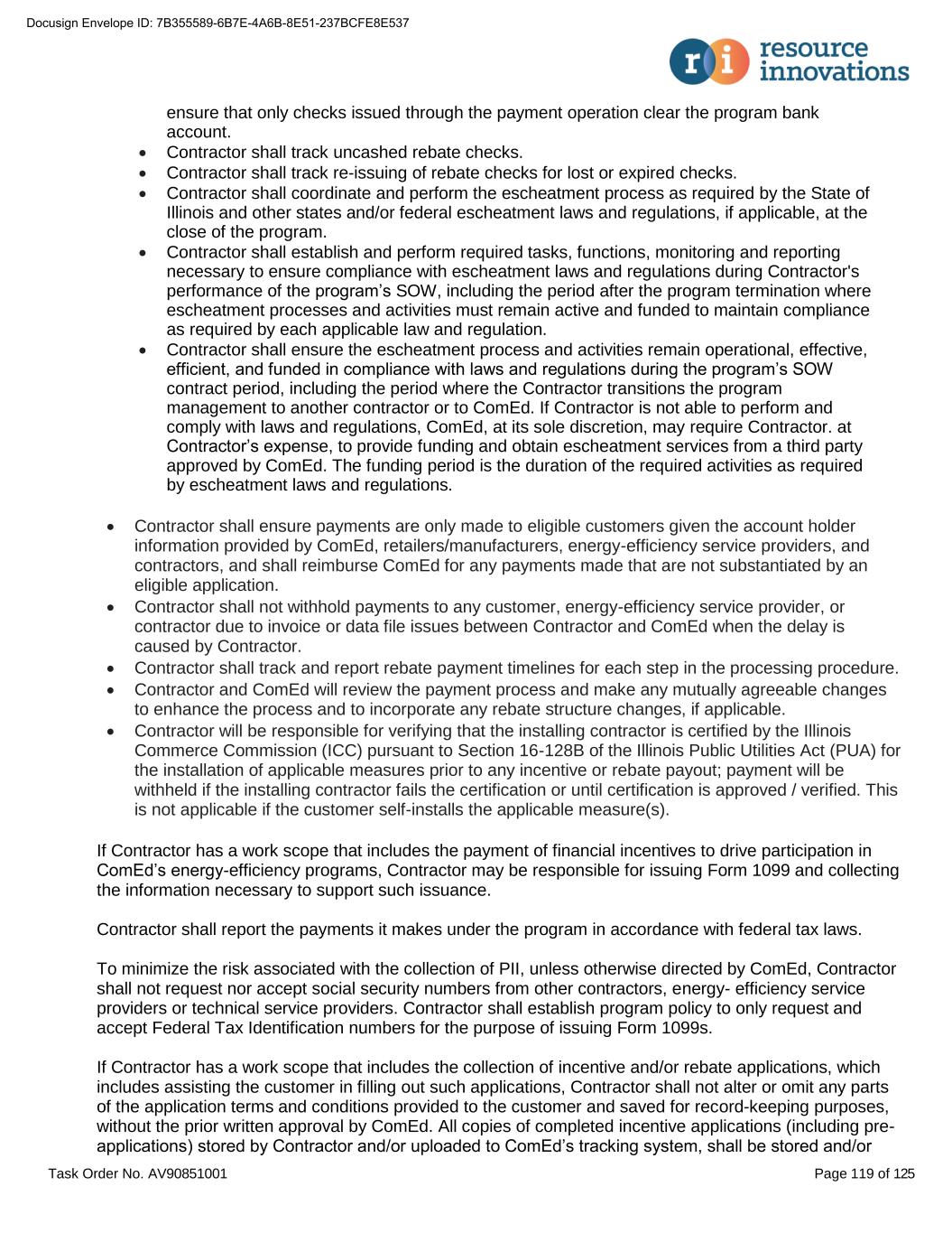 Task Order No. AV90851001 Page 119 of 125 ensure that only checks issued through the payment operation clear the program bank account. Contractor shall track uncashed rebate checks. Contractor shall track re-issuing of rebate checks for lost or expired checks. Contractor shall coordinate and perform the escheatment process as required by the State of Illinois and other states and/or federal escheatment laws and regulations, if applicable, at the close of the program. Contractor shall establish and perform required tasks, functions, monitoring and reporting necessary to ensure compliance with escheatment laws and regulations during Contractor's performance of the program’s SOW, including the period after the program termination where escheatment processes and activities must remain active and funded to maintain compliance as required by each applicable law and regulation. Contractor shall ensure the escheatment process and activities remain operational, effective, efficient, and funded in compliance with laws and regulations during the program’s SOW contract period, including the period where the Contractor transitions the program management to another contractor or to ComEd. If Contractor is not able to perform and comply with laws and regulations, ComEd, at its sole discretion, may require Contractor. at Contractor’s expense, to provide funding and obtain escheatment services from a third party approved by ComEd. The funding period is the duration of the required activities as required by escheatment laws and regulations. Contractor shall ensure payments are only made to eligible customers given the account holder information provided by ComEd, retailers/manufacturers, energy-efficiency service providers, and contractors, and shall reimburse ComEd for any payments made that are not substantiated by an eligible application. Contractor shall not withhold payments to any customer, energy-efficiency service provider, or contractor due to invoice or data file issues between Contractor and ComEd when the delay is caused by Contractor. Contractor shall track and report rebate payment timelines for each step in the processing procedure. Contractor and ComEd will review the payment process and make any mutually agreeable changes to enhance the process and to incorporate any rebate structure changes, if applicable. Contractor will be responsible for verifying that the installing contractor is certified by the Illinois Commerce Commission (ICC) pursuant to Section 16-128B of the Illinois Public Utilities Act (PUA) for the installation of applicable measures prior to any incentive or rebate payout; payment will be withheld if the installing contractor fails the certification or until certification is approved / verified. This is not applicable if the customer self-installs the applicable measure(s). If Contractor has a work scope that includes the payment of financial incentives to drive participation in ComEd’s energy-efficiency programs, Contractor may be responsible for issuing Form 1099 and collecting the information necessary to support such issuance. Contractor shall report the payments it makes under the program in accordance with federal tax laws. To minimize the risk associated with the collection of PII, unless otherwise directed by ComEd, Contractor shall not request nor accept social security numbers from other contractors, energy- efficiency service providers or technical service providers. Contractor shall establish program policy to only request and accept Federal Tax Identification numbers for the purpose of issuing Form 1099s. If Contractor has a work scope that includes the collection of incentive and/or rebate applications, which includes assisting the customer in filling out such applications, Contractor shall not alter or omit any parts of the application terms and conditions provided to the customer and saved for record-keeping purposes, without the prior written approval by ComEd. All copies of completed incentive applications (including pre- applications) stored by Contractor and/or uploaded to ComEd’s tracking system, shall be stored and/or Docusign Envelope ID: 7B355589-6B7E-4A6B-8E51-237BCFE8E537