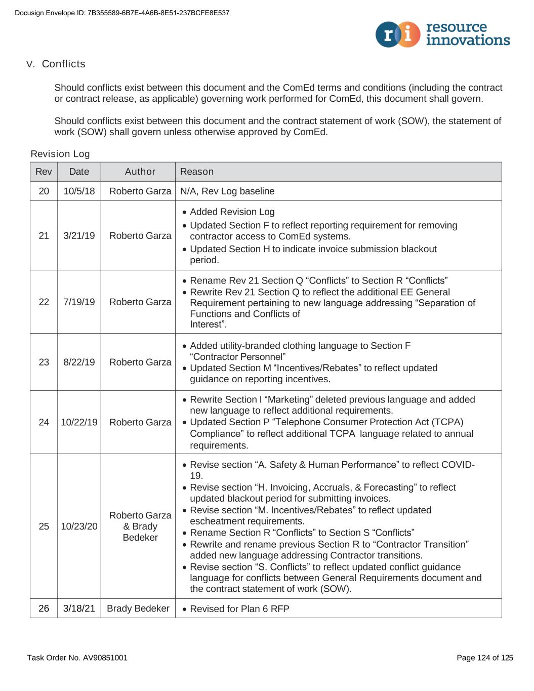 Task Order No. AV90851001 Page 124 of 125 V. Conflicts Should conflicts exist between this document and the ComEd terms and conditions (including the contract or contract release, as applicable) governing work performed for ComEd, this document shall govern. Should conflicts exist between this document and the contract statement of work (SOW), the statement of work (SOW) shall govern unless otherwise approved by ComEd. Revision Log Rev Date Author Reason 20 10/5/18 Roberto Garza N/A, Rev Log baseline 21 3/21/19 Roberto Garza Added Revision Log Updated Section F to reflect reporting requirement for removing contractor access to ComEd systems. Updated Section H to indicate invoice submission blackout period. 22 7/19/19 Roberto Garza Rename Rev 21 Section Q “Conflicts” to Section R “Conflicts” Rewrite Rev 21 Section Q to reflect the additional EE General Requirement pertaining to new language addressing “Separation of Functions and Conflicts of Interest”. 23 8/22/19 Roberto Garza Added utility-branded clothing language to Section F “Contractor Personnel” Updated Section M “Incentives/Rebates” to reflect updated guidance on reporting incentives. 24 10/22/19 Roberto Garza Rewrite Section I “Marketing” deleted previous language and added new language to reflect additional requirements. Updated Section P “Telephone Consumer Protection Act (TCPA) Compliance” to reflect additional TCPA language related to annual requirements. 25 10/23/20 Roberto Garza & Brady Bedeker Revise section “A. Safety & Human Performance” to reflect COVID- 19. Revise section “H. Invoicing, Accruals, & Forecasting” to reflect updated blackout period for submitting invoices. Revise section “M. Incentives/Rebates” to reflect updated escheatment requirements. Rename Section R “Conflicts” to Section S “Conflicts” Rewrite and rename previous Section R to “Contractor Transition” added new language addressing Contractor transitions. Revise section “S. Conflicts” to reflect updated conflict guidance language for conflicts between General Requirements document and the contract statement of work (SOW). 26 3/18/21 Brady Bedeker Revised for Plan 6 RFP Docusign Envelope ID: 7B355589-6B7E-4A6B-8E51-237BCFE8E537