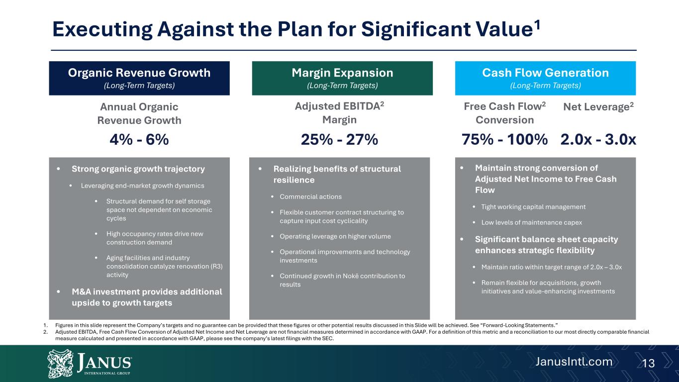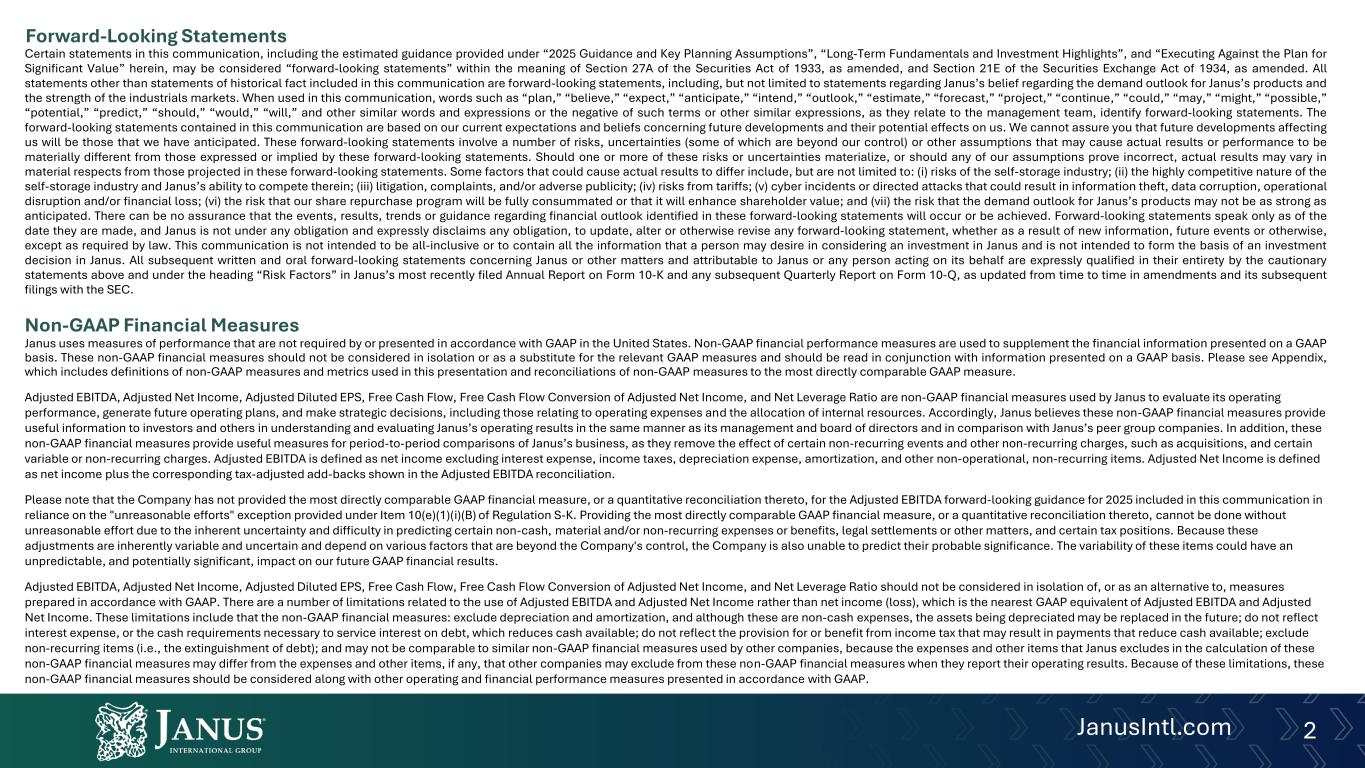 Some factors that could cause actual results to differ materially from forward-looking statements or historical performance: (i) risks of the self-storage industry; (ii) the highly competitive nature of the self-storage industry and Janus’s ability to compete therein; (iii) litigation, complaints, and/or adverse publicity; (iv) risks from tariffs; (v) cyber incidents or directed attacks that could result in information theft, data corruption, operational disruption, and/or financial loss; (vi) the risk that our share repurchase program will be fully consummated or that it will enhance shareholder value; and (vii) the risk that the demand outlook for Janus’s products may not be as strong as anticipated. There can be no assurance that the events, results, trends or guidance regarding financial outlook identified in these forward-looking statements will occur or be achieved. Forward-looking statements speak only as of the date they are made, and Janus is not under any obligation and expressly disclaims any obligation, to update, alter, or otherwise revise any forward-looking statement, whether as a result of new information, future events or otherwise, except as required by law. This communication is not intended to be all-inclusive or to contain all the information that a person may desire in considering an investment in Janus and is not intended to form the basis of an investment decision in Janus. All subsequent written and oral forward-looking statements concerning Janus or other matters and attributable to Janus or any person acting on its behalf are expressly qualified in their entirety by the cautionary statements above and under the heading “Risk Factors” in Janus’s most recently filed Annual Report on Form 10-K and Quarterly Report on Form 10-Q, as updated from time to time in amendments and its subsequent filings with the SEC.