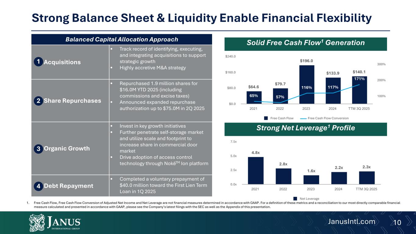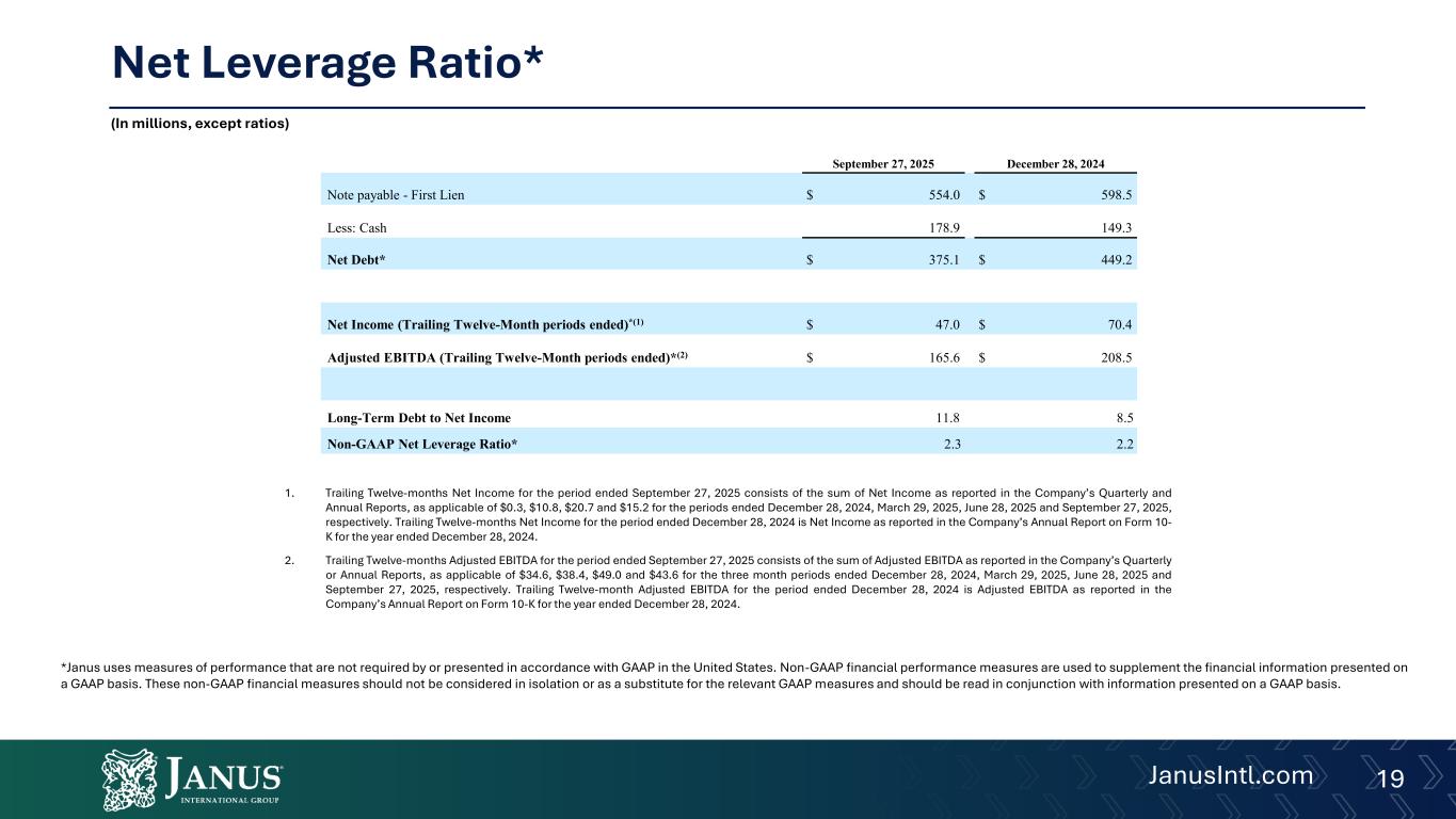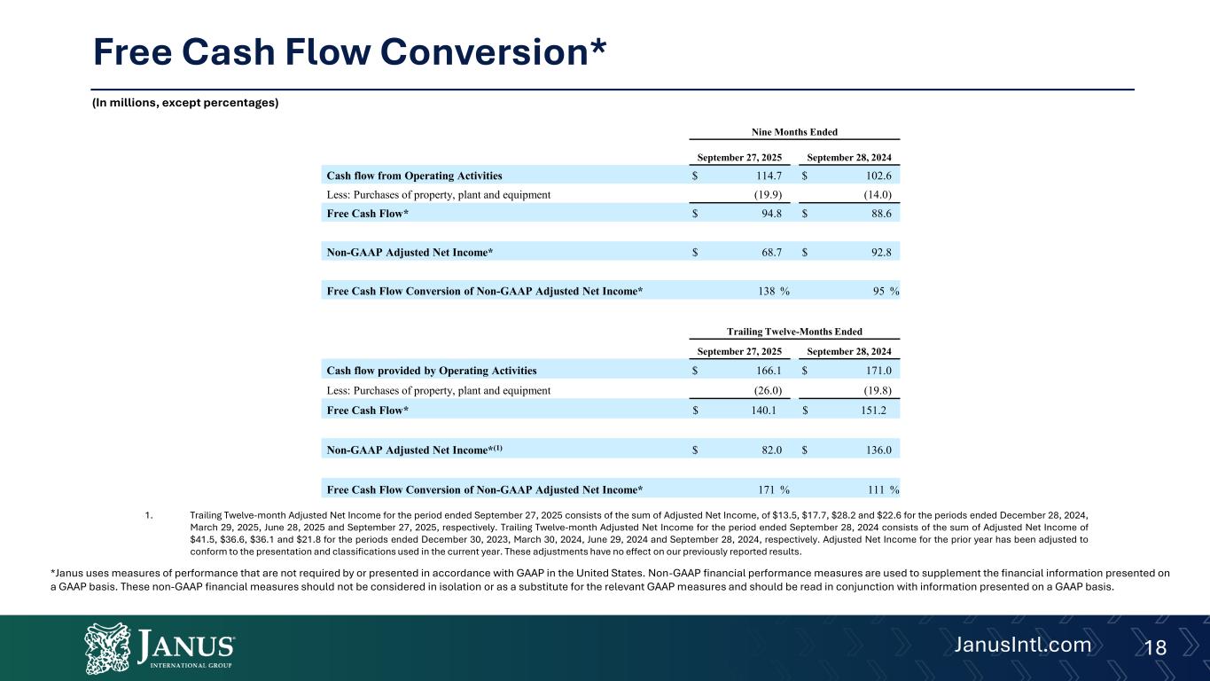 Adjusted EBITDA, Adjusted EBITDA Margin, Adjusted Net Income, Adjusted Earnings Per Share (EPS), Free Cash Flow Conversion, Net Leverage Ratio, and Net Debt are non-GAAP financial measures used by Janus to evaluate its operating performance, generate future operating plans, and make strategic decisions, including those relating to operating expenses and the allocation of internal resources. Accordingly, Janus believes Adjusted EBITDA, Adjusted EBITDA Margin, Adjusted Net Income, Adjusted EPS, Free Cash Flow Conversion, Net Leverage Ratio, and Net Debt provide useful information to investors and others in understanding and evaluating Janus’s operating results in the same manner as its management and board of directors and in comparison with Janus’s peer group companies. In addition, Adjusted EBITDA, Adjusted EBITDA Margin, Adjusted Net Income, Adjusted EPS, Free Cash Flow Conversion, Net Leverage Ratio, and Net Debt provide useful measures for period-to-period comparisons of Janus’s business, as they remove the effect of certain non-recurring events and other non-recurring charges, such as acquisitions, and certain variable or non-recurring charges. Adjusted EBITDA is defined as net income excluding interest expense, income taxes, depreciation expense, amortization, and other non-operational, non-recurring items. Adjusted Net Income is defined as net income plus the corresponding tax-adjusted add-backs shown in the Adjusted EBITDA reconciliation.