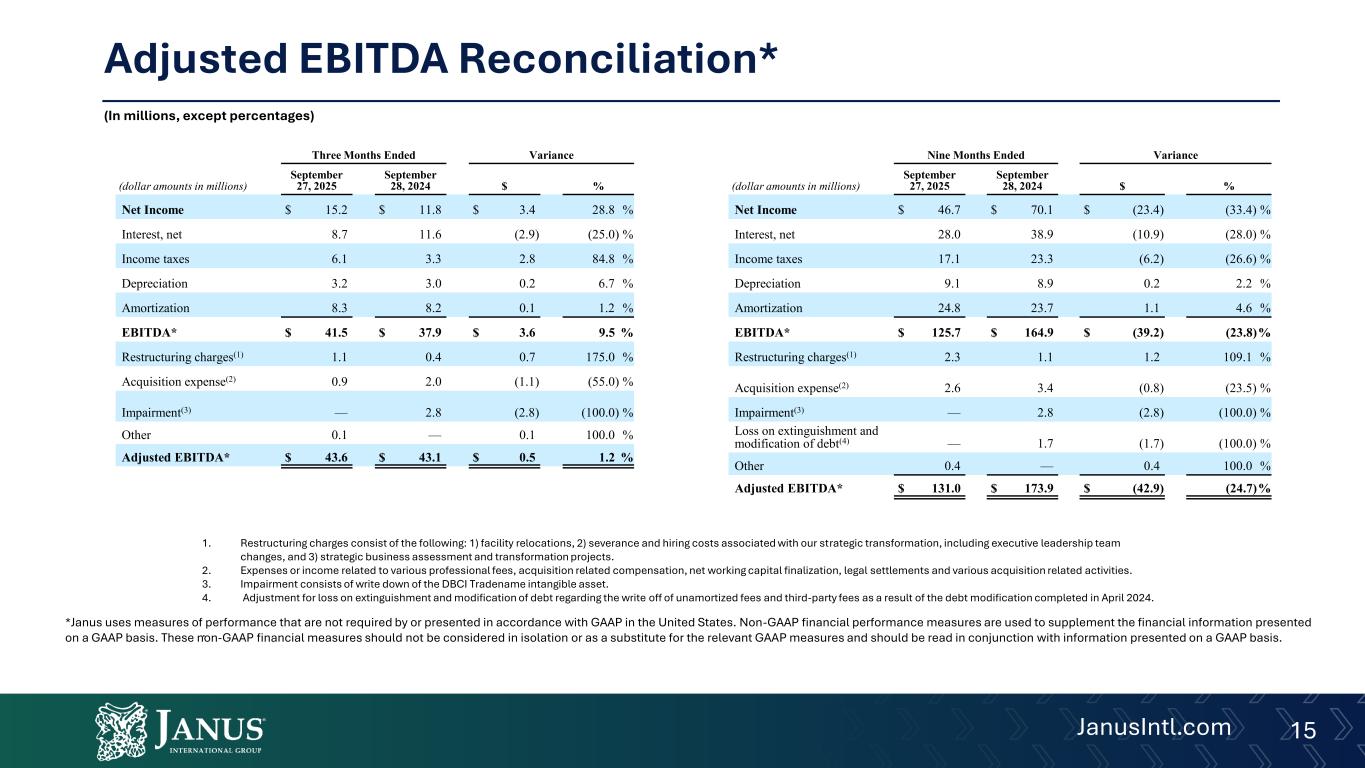 (1)Net Income Adjustments for the three month period ended September 27, 2025 include $1.1 of restructuring charges, $0.9 of acquisition expenses and $0.1 of other expenses. Net Income Adjustments for the nine month period ended September 27, 2025 include $2.6 of acquisition expenses, $2.3 of restructuring charges and $0.4 of other. Refer to the Adjusted EBITDA table above for further details.