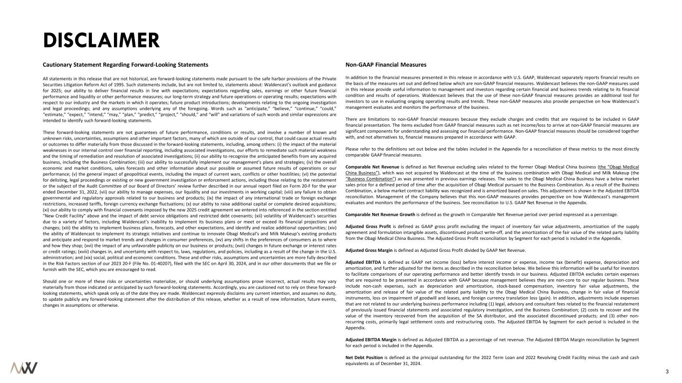 DISCLAIMER Cautionary Statement Regarding Forward-Looking Statements All statements in this release that are not historical, are forward-looking statements made pursuant to the safe harbor provisions of the Private Securities Litigation Reform Act of 1995. Such statements include, but are not limited to, statements about: Waldencast’s outlook and guidance for 2025; our ability to deliver financial results in line with expectations; expectations regarding sales, earnings or other future financial performance and liquidity or other performance measures; our long-term strategy and future operations or operating results; expectations with respect to our industry and the markets in which it operates; future product introductions; developments relating to the ongoing investigation and legal proceedings; and any assumptions underlying any of the foregoing. Words such as “anticipate,” “believe,” “continue,” “could,” “estimate,” “expect,” “intend,” “may,” “plan,” “predict,” “project,” “should,” and “will” and variations of such words and similar expressions are intended to identify such forward-looking statements. These forward-looking statements are not guarantees of future performance, conditions or results, and involve a number of known and unknown risks, uncertainties, assumptions and other important factors, many of which are outside of our control, that could cause actual results or outcomes to differ materially from those discussed in the forward-looking statements, including, among others: (i) the impact of the material weaknesses in our internal control over financial reporting, including associated investigations, our efforts to remediate such material weakness and the timing of remediation and resolution of associated investigations; (ii) our ability to recognize the anticipated benefits from any acquired business, including the Business Combination; (iii) our ability to successfully implement our management’s plans and strategies; (iv) the overall economic and market conditions, sales forecasts and other information about our possible or assumed future results of operations or our performance; (v) the general impact of geopolitical events, including the impact of current wars, conflicts or other hostilities; (vi) the potential for delisting, legal proceedings or existing or new government investigation or enforcement actions, including those relating to the restatement or the subject of the Audit Committee of our Board of Directors’ review further described in our annual report filed on Form 20-F for the year ended December 31, 2022, (vii) our ability to manage expenses, our liquidity and our investments in working capital; (viii) any failure to obtain governmental and regulatory approvals related to our business and products; (ix) the impact of any international trade or foreign exchange restrictions, increased tariffs, foreign currency exchange fluctuations; (x) our ability to raise additional capital or complete desired acquisitions; (xi) our ability to comply with financial covenants imposed by the new 2025 credit agreement we entered into referenced in the section entitled "New Credit Facility" above and the impact of debt service obligations and restricted debt covenants; (xii) volatility of Waldencast’s securities due to a variety of factors, including Waldencast’s inability to implement its business plans or meet or exceed its financial projections and changes; (xiii) the ability to implement business plans, forecasts, and other expectations, and identify and realize additional opportunities; (xiv) the ability of Waldencast to implement its strategic initiatives and continue to innovate Obagi Medical’s and Milk Makeup’s existing products and anticipate and respond to market trends and changes in consumer preferences, (xv) any shifts in the preferences of consumers as to where and how they shop; (xvi) the impact of any unfavorable publicity on our business or products; (xvii) changes in future exchange or interest rates or credit ratings; (xviii) changes in, and uncertainty with respect to, laws, regulations, and policies, including as a result of the change in the U.S. administration; and (xix) social, political and economic conditions. These and other risks, assumptions and uncertainties are more fully described in the Risk Factors section of our 2023 20-F (File No. 01-40207), filed with the SEC on April 30, 2024, and in our other documents that we file or furnish with the SEC, which you are encouraged to read. Should one or more of these risks or uncertainties materialize, or should underlying assumptions prove incorrect, actual results may vary materially from those indicated or anticipated by such forward-looking statements. Accordingly, you are cautioned not to rely on these forward- looking statements, which speak only as of the date they are made. Waldencast expressly disclaims any current intention, and assumes no duty, to update publicly any forward-looking statement after the distribution of this release, whether as a result of new information, future events, changes in assumptions or otherwise. Non-GAAP Financial Measures In addition to the financial measures presented in this release in accordance with U.S. GAAP, Waldencast separately reports financial results on the basis of the measures set out and defined below which are non-GAAP financial measures. Waldencast believes the non-GAAP measures used in this release provide useful information to management and investors regarding certain financial and business trends relating to its financial condition and results of operations. Waldencast believes that the use of these non-GAAP financial measures provides an additional tool for investors to use in evaluating ongoing operating results and trends. These non-GAAP measures also provide perspective on how Waldencast’s management evaluates and monitors the performance of the business. There are limitation