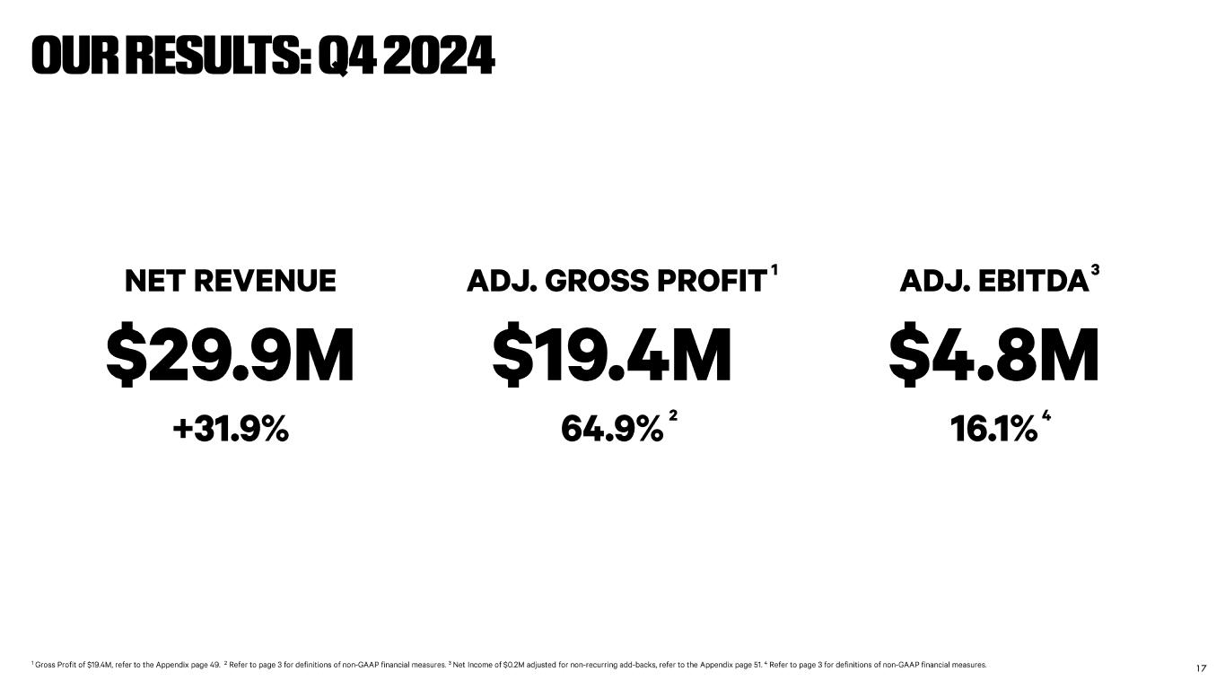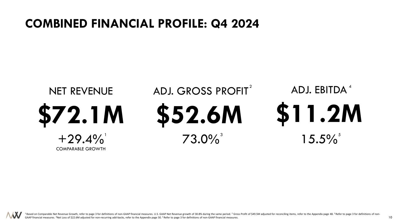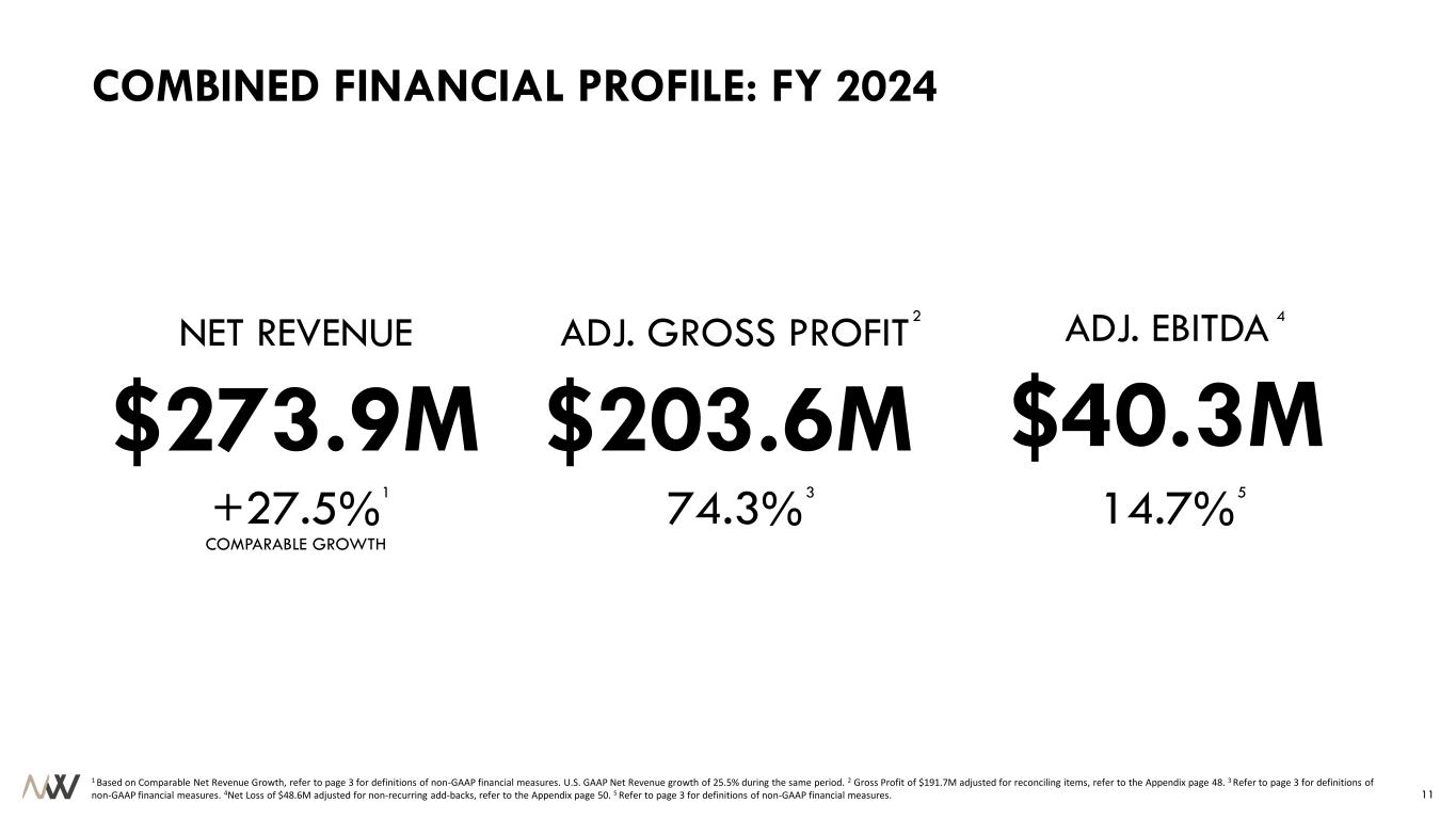 COMBINED FINANCIAL PROFILE: Q4 2024 NET REVENUE $72.1M +29.4% 1 ADJ. GROSS PROFIT $52.6M 2 73.0% 3 ADJ. EBITDA $11.2M 15.5% 5 4 COMPARABLE GROWTH 1 Based on Comparable Net Revenue Growth, refer to page 3 for definitions of non-GAAP financial measures. U.S. GAAP Net Revenue growth of 30.8% during the same period. 2 Gross Profit of $49.5M adjusted for reconciling items, refer to the Appendix page 48. 3 Refer to page 3 for definitions of non- GAAP financial measures. 4Net Loss of $22.6M adjusted for non-recurring add-backs, refer to the Appendix page 50. 5 Refer to page 3 for definitions of non-GAAP financial measures. 10