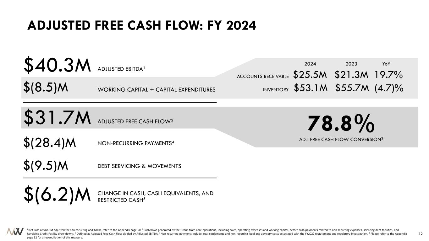 ADJUSTED FREE CASH FLOW: FY 2024 12 1 Net Loss of $48.6M adjusted for non-recurring add-backs, refer to the Appendix page 50. 2 Cash flows generated by the Group from core operations, including sales, operating expenses and working capital, before cash payments related to non-recurring expenses, servicing debt facilities, and Revolving Credit Facility draw downs. 3 Defined as Adjusted Free Cash Flow divided by Adjusted EBITDA. 4 Non-recurring payments include legal settlements and non-recurring legal and advisory costs associated with the FY2022 restatement and regulatory investigation. 5 Please refer to the Appendix page 52 for a reconciliation of this measure. WORKING CAPITAL + CAPITAL EXPENDITURES$(8.5)M $40.3M ADJUSTED EBITDA1 $31.7M ADJUSTED FREE CASH FLOW2 $(6.2)M CHANGE IN CASH, CASH EQUIVALENTS, AND RESTRICTED CASH5 NON-RECURRING PAYMENTS4$(28.4)M DEBT SERVICING & MOVEMENTS$(9.5)M 2024 $25.5M $21.3M 19.7% $53.1M $55.7M (4.7)% 2023 YoY ACCOUNTS RECEIVABLE INVENTORY 78.8% ADJ. FREE CASH FLOW CONVERSION3