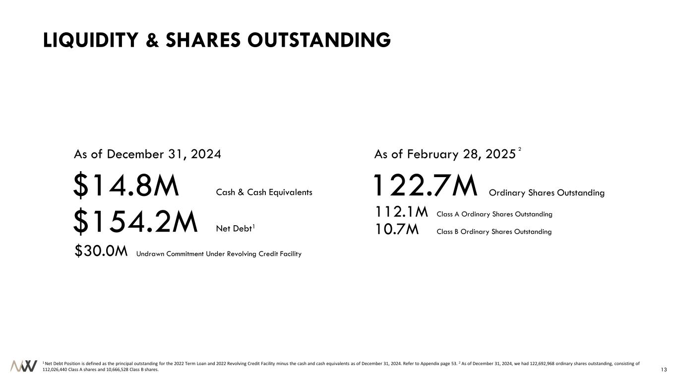 LIQUIDITY & SHARES OUTSTANDING $14.8M As of December 31, 2024 As of February 28, 2025 Net Debt1 Ordinary Shares Outstanding Class A Ordinary Shares Outstanding Class B Ordinary Shares Outstanding$154.2M 122.7M 112.1M 10.7M Cash & Cash Equivalents Undrawn Commitment Under Revolving Credit Facility$30.0M 1 Net Debt Position is defined as the principal outstanding for the 2022 Term Loan and 2022 Revolving Credit Facility minus the cash and cash equivalents as of December 31, 2024. Refer to Appendix page 53. 2 As of December 31, 2024, we had 122,692,968 ordinary shares outstanding, consisting of 112,026,440 Class A shares and 10,666,528 Class B shares. 2 13