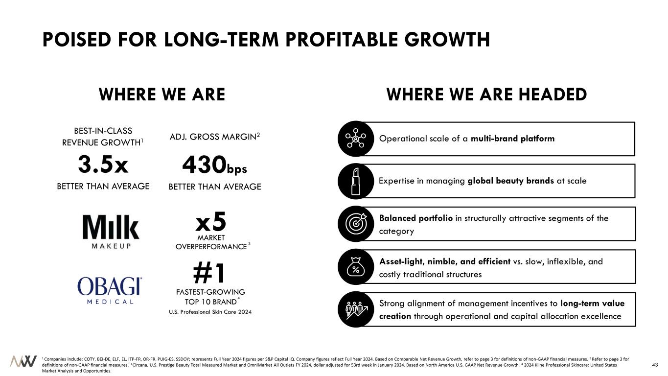POISED FOR LONG-TERM PROFITABLE GROWTH WHERE WE ARE WHERE WE ARE HEADED Strong alignment of management incentives to long-term value creation through operational and capital allocation excellence Expertise in managing global beauty brands at scale Asset-light, nimble, and efficient vs. slow, inflexible, and costly traditional structures Operational scale of a multi-brand platform Balanced portfolio in structurally attractive segments of the category BETTER THAN AVERAGE 3.5x BEST-IN-CLASS REVENUE GROWTH1 BETTER THAN AVERAGE 430bps ADJ. GROSS MARGIN2 x5 MARKET OVERPERFORMANCE 3 #1 FASTEST-GROWING TOP 10 BRAND 4 U.S. Professional Skin Care 2024 1 Companies include: COTY, BEI-DE, ELF, EL, ITP-FR, OR-FR, PUIG-ES, SSDOY; represents Full Year 2024 figures per S&P Capital IQ. Company figures reflect Full Year 2024. Based on Comparable Net Revenue Growth, refer to page 3 for definitions of non-GAAP financial measures. 2 Refer to page 3 for definitions of non-GAAP financial measures. 3 Circana, U.S. Prestige Beauty Total Measured Market and OmniMarket All Outlets FY 2024, dollar adjusted for 53rd week in January 2024. Based on North America U.S. GAAP Net Revenue Growth. 4 2024 Kline Professional Skincare: United States Market Analysis and Opportunities. 43
