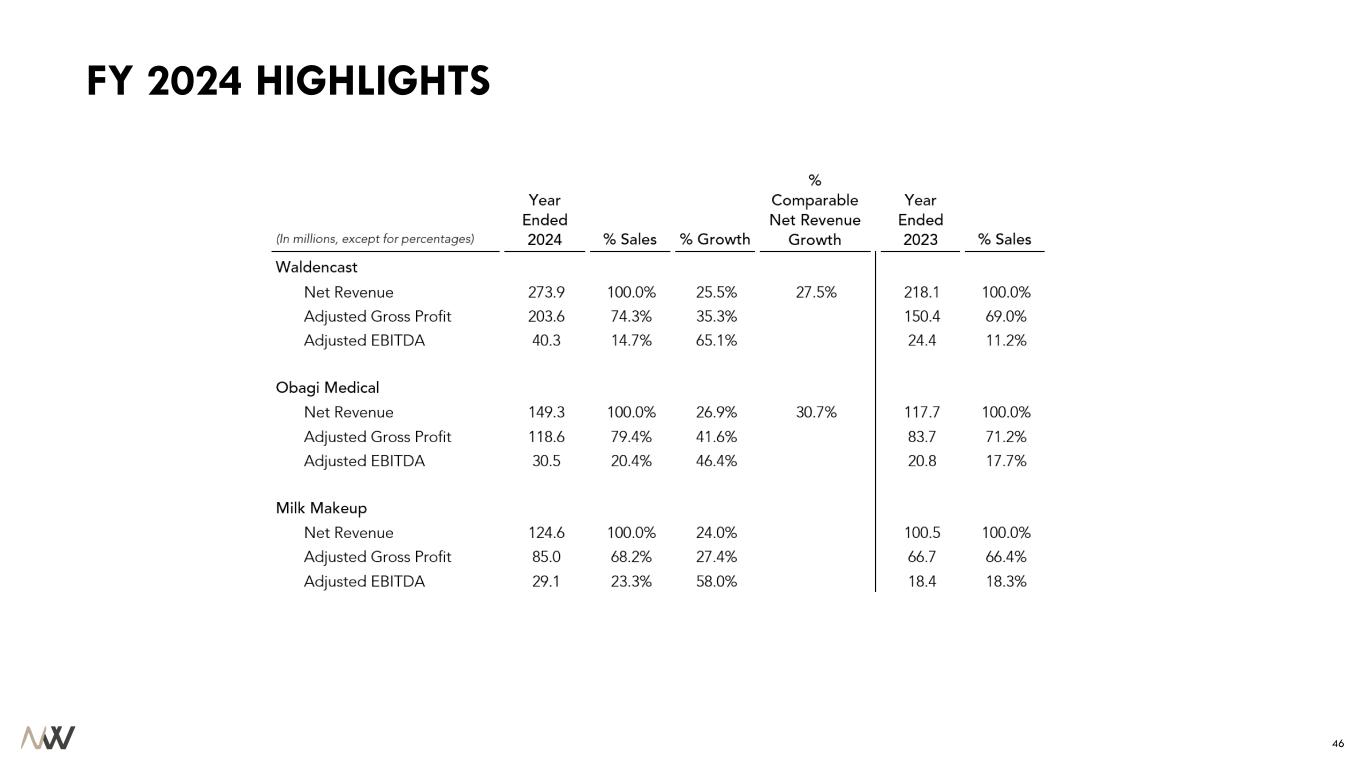 DISCLAIMER Cautionary Statement Regarding Forward-Looking Statements All statements in this release that are not historical, are forward-looking statements made pursuant to the safe harbor provisions of the Private Securities Litigation Reform Act of 1995. Such statements include, but are not limited to, statements about: Waldencast’s outlook and guidance for 2025; our ability to deliver financial results in line with expectations; expectations regarding sales, earnings or other future financial performance and liquidity or other performance measures; our long-term strategy and future operations or operating results; expectations with respect to our industry and the markets in which it operates; future product introductions; developments relating to the ongoing investigation and legal proceedings; and any assumptions underlying any of the foregoing. Words such as “anticipate,” “believe,” “continue,” “could,” “estimate,” “expect,” “intend,” “may,” “plan,” “predict,” “project,” “should,” and “will” and variations of such words and similar expressions are intended to identify such forward-looking statements. These forward-looking statements are not guarantees of future performance, conditions or results, and involve a number of known and unknown risks, uncertainties, assumptions and other important factors, many of which are outside of our control, that could cause actual results or outcomes to differ materially from those discussed in the forward-looking statements, including, among others: (i) the impact of the material weaknesses in our internal control over financial reporting, including associated investigations, our efforts to remediate such material weakness and the timing of remediation and resolution of associated investigations; (ii) our ability to recognize the anticipated benefits from any acquired business, including the Business Combination; (iii) our ability to successfully implement our management’s plans and strategies; (iv) the overall economic and market conditions, sales forecasts and other information about our possible or assumed future results of operations or our performance; (v) the general impact of geopolitical events, including the impact of current wars, conflicts or other hostilities; (vi) the potential for delisting, legal proceedings or existing or new government investigation or enforcement actions, including those relating to the restatement or the subject of the Audit Committee of our Board of Directors’ review further described in our annual report filed on Form 20-F for the year ended December 31, 2022, (vii) our ability to manage expenses, our liquidity and our investments in working capital; (viii) any failure to obtain governmental and regulatory approvals related to our business and products; (ix) the impact of any international trade or foreign exchange restrictions, increased tariffs, foreign currency exchange fluctuations; (x) our ability to raise additional capital or complete desired acquisitions; (xi) our ability to comply with financial covenants imposed by the new 2025 credit agreement we entered into referenced in the section entitled "New Credit Facility" above and the impact of debt service obligations and restricted debt covenants; (xii) volatility of Waldencast’s securities due to a variety of factors, including Waldencast’s inability to implement its business plans or meet or exceed its financial projections and changes; (xiii) the ability to implement business plans, forecasts, and other expectations, and identify and realize additional opportunities; (xiv) the ability of Waldencast to implement its strategic initiatives and continue to innovate Obagi Medical’s and Milk Makeup’s existing products and anticipate and respond to market trends and changes in consumer preferences, (xv) any shifts in the preferences of consumers as to where and how they shop; (xvi) the impact of any unfavorable publicity on our business or products; (xvii) changes in future exchange or interest rates or credit ratings; (xviii) changes in, and uncertainty with respect to, laws, regulations, and policies, including as a result of the change in the U.S. administration; and (xix) social, political and economic conditions. These and other risks, assumptions and uncertainties are more fully described in the Risk Factors section of our 2023 20-F (File No. 01-40207), filed with the SEC on April 30, 2024, and in our other documents that we file or furnish with the SEC, which you are encouraged to read. Should one or more of these risks or uncertainties materialize, or should underlying assumptions prove incorrect, actual results may vary materially from those indicated or anticipated by such forward-looking statements. Accordingly, you are cautioned not to rely on these forward- looking statements, which speak only as of the date they are made. Waldencast expressly disclaims any current intention, and assumes no duty, to update publicly any forward-looking statement after the distribution of this release, whether as a result of new information, future events, changes in assumptions or otherwise. Non-GAAP Financial Measures In addition to the financial measures presented in this release in accordance with U.S. GAAP, Waldencast separately reports financial results on the basis of the measures set out and defined below which are non-GAAP financial measures. Waldencast believes the non-GAAP measures used in this release provide useful information to management and investors regarding certain financial and business trends relating to its financial condition and results of operations. Waldencast believes that the use of these non-GAAP financial measures provides an additional tool for investors to use in evaluating ongoing operating results and trends. These non-GAAP measures also provide perspective on how Waldencast’s management evaluates and monitors the performance of the business. There are limitation
