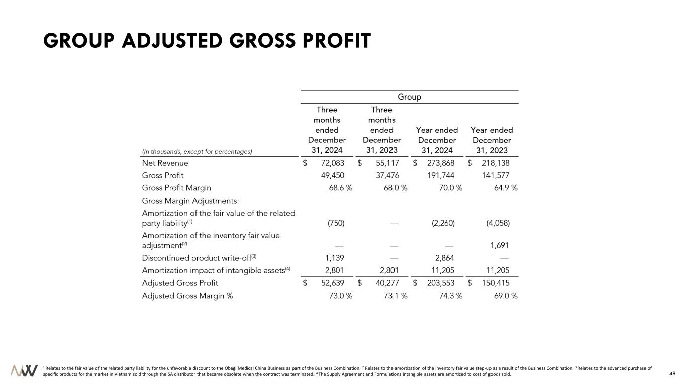 GROUP ADJUSTED GROSS PROFIT 1 Relates to the fair value of the related party liability for the unfavorable discount to the Obagi Medical China Business as part of the Business Combination. 2 Relates to the amortization of the inventory fair value step-up as a result of the Business Combination. 3 Relates to the advanced purchase of specific products for the market in Vietnam sold through the SA distributor that became obsolete when the contract was terminated. 4 The Supply Agreement and Formulations intangible assets are amortized to cost of goods sold. 48