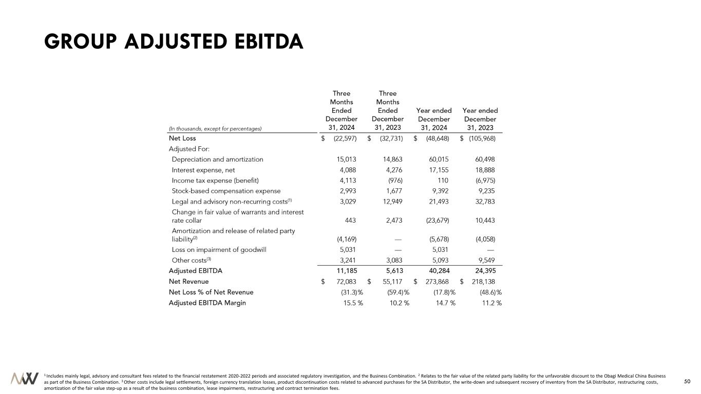 GROUP ADJUSTED EBITDA 1 Includes mainly legal, advisory and consultant fees related to the financial restatement 2020-2022 periods and associated regulatory investigation, and the Business Combination. 2 Relates to the fair value of the related party liability for the unfavorable discount to the Obagi Medical China Business as part of the Business Combination. 3 Other costs include legal settlements, foreign currency translation losses, product discontinuation costs related to advanced purchases for the SA Distributor, the write-down and subsequent recovery of inventory from the SA Distributor, restructuring costs, amortization of the fair value step-up as a result of the business combination, lease impairments, restructuring and contract termination fees. 50