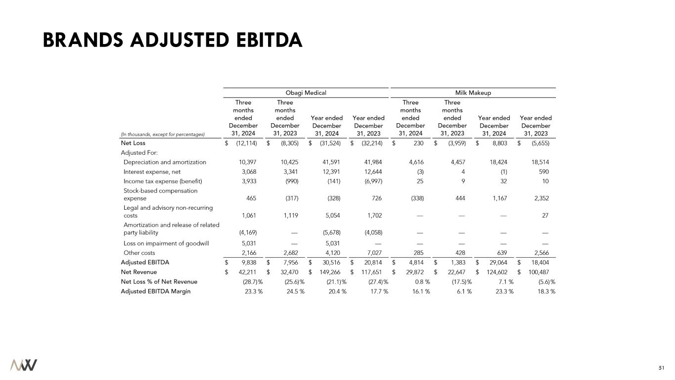DISCLAIMER Cautionary Statement Regarding Forward-Looking Statements All statements in this release that are not historical, are forward-looking statements made pursuant to the safe harbor provisions of the Private Securities Litigation Reform Act of 1995. Such statements include, but are not limited to, statements about: Waldencast’s outlook and guidance for 2025; our ability to deliver financial results in line with expectations; expectations regarding sales, earnings or other future financial performance and liquidity or other performance measures; our long-term strategy and future operations or operating results; expectations with respect to our industry and the markets in which it operates; future product introductions; developments relating to the ongoing investigation and legal proceedings; and any assumptions underlying any of the foregoing. Words such as “anticipate,” “believe,” “continue,” “could,” “estimate,” “expect,” “intend,” “may,” “plan,” “predict,” “project,” “should,” and “will” and variations of such words and similar expressions are intended to identify such forward-looking statements. These forward-looking statements are not guarantees of future performance, conditions or results, and involve a number of known and unknown risks, uncertainties, assumptions and other important factors, many of which are outside of our control, that could cause actual results or outcomes to differ materially from those discussed in the forward-looking statements, including, among others: (i) the impact of the material weaknesses in our internal control over financial reporting, including associated investigations, our efforts to remediate such material weakness and the timing of remediation and resolution of associated investigations; (ii) our ability to recognize the anticipated benefits from any acquired business, including the Business Combination; (iii) our ability to successfully implement our management’s plans and strategies; (iv) the overall economic and market conditions, sales forecasts and other information about our possible or assumed future results of operations or our performance; (v) the general impact of geopolitical events, including the impact of current wars, conflicts or other hostilities; (vi) the potential for delisting, legal proceedings or existing or new government investigation or enforcement actions, including those relating to the restatement or the subject of the Audit Committee of our Board of Directors’ review further described in our annual report filed on Form 20-F for the year ended December 31, 2022, (vii) our ability to manage expenses, our liquidity and our investments in working capital; (viii) any failure to obtain governmental and regulatory approvals related to our business and products; (ix) the impact of any international trade or foreign exchange restrictions, increased tariffs, foreign currency exchange fluctuations; (x) our ability to raise additional capital or complete desired acquisitions; (xi) our ability to comply with financial covenants imposed by the new 2025 credit agreement we entered into referenced in the section entitled "New Credit Facility" above and the impact of debt service obligations and restricted debt covenants; (xii) volatility of Waldencast’s securities due to a variety of factors, including Waldencast’s inability to implement its business plans or meet or exceed its financial projections and changes; (xiii) the ability to implement business plans, forecasts, and other expectations, and identify and realize additional opportunities; (xiv) the ability of Waldencast to implement its strategic initiatives and continue to innovate Obagi Medical’s and Milk Makeup’s existing products and anticipate and respond to market trends and changes in consumer preferences, (xv) any shifts in the preferences of consumers as to where and how they shop; (xvi) the impact of any unfavorable publicity on our business or products; (xvii) changes in future exchange or interest rates or credit ratings; (xviii) changes in, and uncertainty with respect to, laws, regulations, and policies, including as a result of the change in the U.S. administration; and (xix) social, political and economic conditions. These and other risks, assumptions and uncertainties are more fully described in the Risk Factors section of our 2023 20-F (File No. 01-40207), filed with the SEC on April 30, 2024, and in our other documents that we file or furnish with the SEC, which you are encouraged to read. Should one or more of these risks or uncertainties materialize, or should underlying assumptions prove incorrect, actual results may vary materially from those indicated or anticipated by such forward-looking statements. Accordingly, you are cautioned not to rely on these forward- looking statements, which speak only as of the date they are made. Waldencast expressly disclaims any current intention, and assumes no duty, to update publicly any forward-looking statement after the distribution of this release, whether as a result of new information, future events, changes in assumptions or otherwise. Non-GAAP Financial Measures In addition to the financial measures presented in this release in accordance with U.S. GAAP, Waldencast separately reports financial results on the basis of the measures set out and defined below which are non-GAAP financial measures. Waldencast believes the non-GAAP measures used in this release provide useful information to management and investors regarding certain financial and business trends relating to its financial condition and results of operations. Waldencast believes that the use of these non-GAAP financial measures provides an additional tool for investors to use in evaluating ongoing operating results and trends. These non-GAAP measures also provide perspective on how Waldencast’s management evaluates and monitors the performance of the business. There are limitation