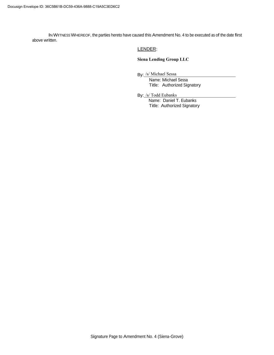 Signature Page to Amendment No. 4 (Siena-Grove) IN WITNESS WHEREOF, the parties hereto have caused this Amendment No. 4 to be executed as of the date first above written. LENDER: Siena Lending Group LLC By: Name: Michael Sessa Title: Authorized Signatory By: Name: Daniel T. Eubanks Title: Authorized Signatory Docusign Envelope ID: 36C5B61B-DC59-436A-9888-C19A5C3ED6C2 /s/ Michael Sessa /s/ Todd Eubanks