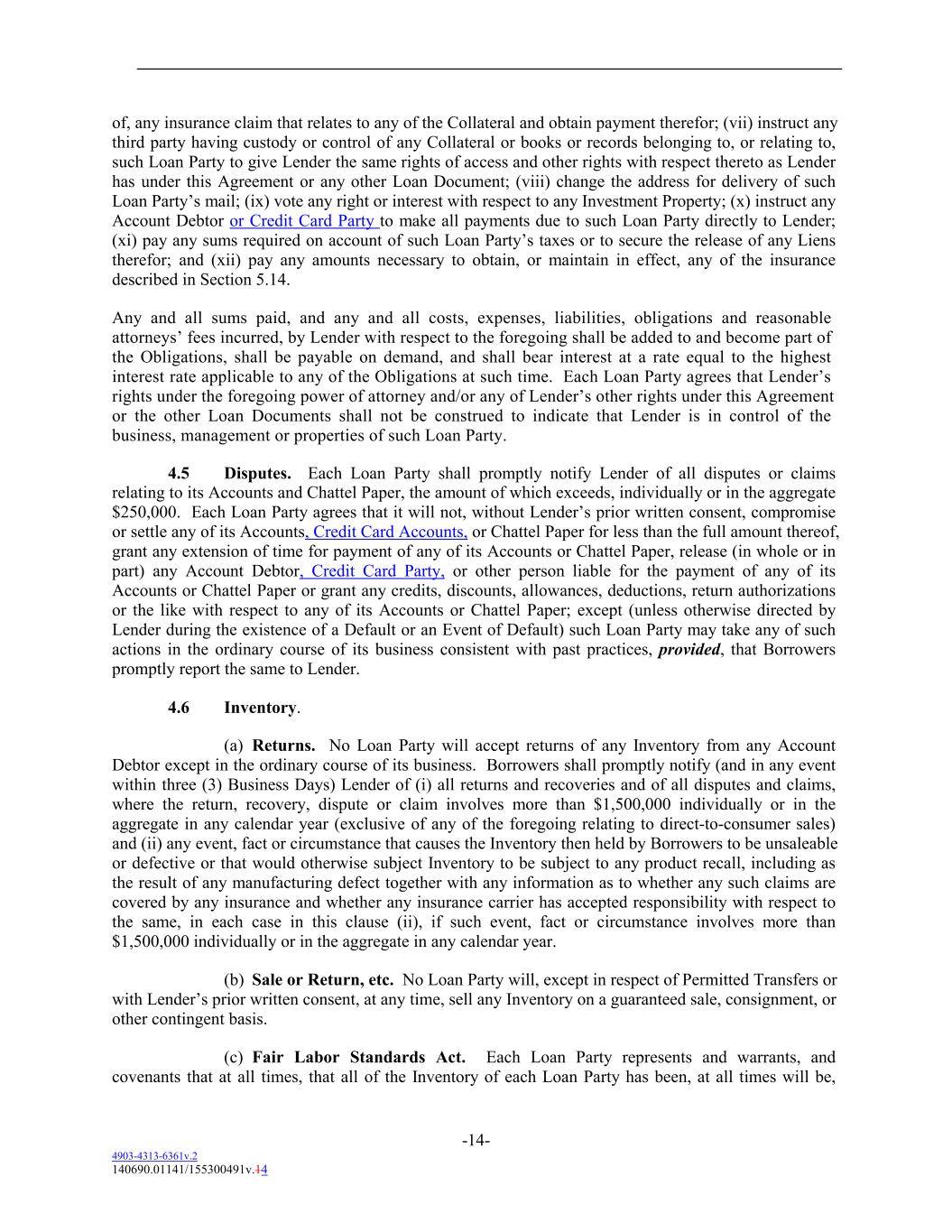 of, any insurance claim that relates to any of the Collateral and obtain payment therefor; (vii) instruct any third party having custody or control of any Collateral or books or records belonging to, or relating to, such Loan Party to give Lender the same rights of access and other rights with respect thereto as Lender has under this Agreement or any other Loan Document; (viii) change the address for delivery of such Loan Party’s mail; (ix) vote any right or interest with respect to any Investment Property; (x) instruct any Account Debtor or Credit Card Party to make all payments due to such Loan Party directly to Lender; (xi) pay any sums required on account of such Loan Party’s taxes or to secure the release of any Liens therefor; and (xii) pay any amounts necessary to obtain, or maintain in effect, any of the insurance described in Section 5.14. Any and all sums paid, and any and all costs, expenses, liabilities, obligations and reasonable attorneys’ fees incurred, by Lender with respect to the foregoing shall be added to and become part of the Obligations, shall be payable on demand, and shall bear interest at a rate equal to the highest interest rate applicable to any of the Obligations at such time. Each Loan Party agrees that Lender’s rights under the foregoing power of attorney and/or any of Lender’s other rights under this Agreement or the other Loan Documents shall not be construed to indicate that Lender is in control of the business, management or properties of such Loan Party. 4.5 Disputes. Each Loan Party shall promptly notify Lender of all disputes or claims relating to its Accounts and Chattel Paper, the amount of which exceeds, individually or in the aggregate $250,000. Each Loan Party agrees that it will not, without Lender’s prior written consent, compromise or settle any of its Accounts, Credit Card Accounts, or Chattel Paper for less than the full amount thereof, grant any extension of time for payment of any of its Accounts or Chattel Paper, release (in whole or in part) any Account Debtor, Credit Card Party, or other person liable for the payment of any of its Accounts or Chattel Paper or grant any credits, discounts, allowances, deductions, return authorizations or the like with respect to any of its Accounts or Chattel Paper; except (unless otherwise directed by Lender during the existence of a Default or an Event of Default) such Loan Party may take any of such actions in the ordinary course of its business consistent with past practices, provided, that Borrowers promptly report the same to Lender. 4.6 Inventory. (a) Returns. No Loan Party will accept returns of any Inventory from any Account Debtor except in the ordinary course of its business. Borrowers shall promptly notify (and in any event within three (3) Business Days) Lender of (i) all returns and recoveries and of all disputes and claims, where the return, recovery, dispute or claim involves more than $1,500,000 individually or in the aggregate in any calendar year (exclusive of any of the foregoing relating to direct-to-consumer sales) and (ii) any event, fact or circumstance that causes the Inventory then held by Borrowers to be unsaleable or defective or that would otherwise subject Inventory to be subject to any product recall, including as the result of any manufacturing defect together with any information as to whether any such claims are covered by any insurance and whether any insurance carrier has accepted responsibility with respect to the same, in each case in this clause (ii), if such event, fact or circumstance involves more than $1,500,000 individually or in the aggregate in any calendar year. (b) Sale or Return, etc. No Loan Party will, except in respect of Permitted Transfers or with Lender’s prior written consent, at any time, sell any Inventory on a guaranteed sale, consignment, or other contingent basis. (c) Fair Labor Standards Act. Each Loan Party represents and warrants, and covenants that at all times, that all of the Inventory of each Loan Party has been, at all times will be, -14- 4903-4313-6361v.2 140690.01141/155300491v.14