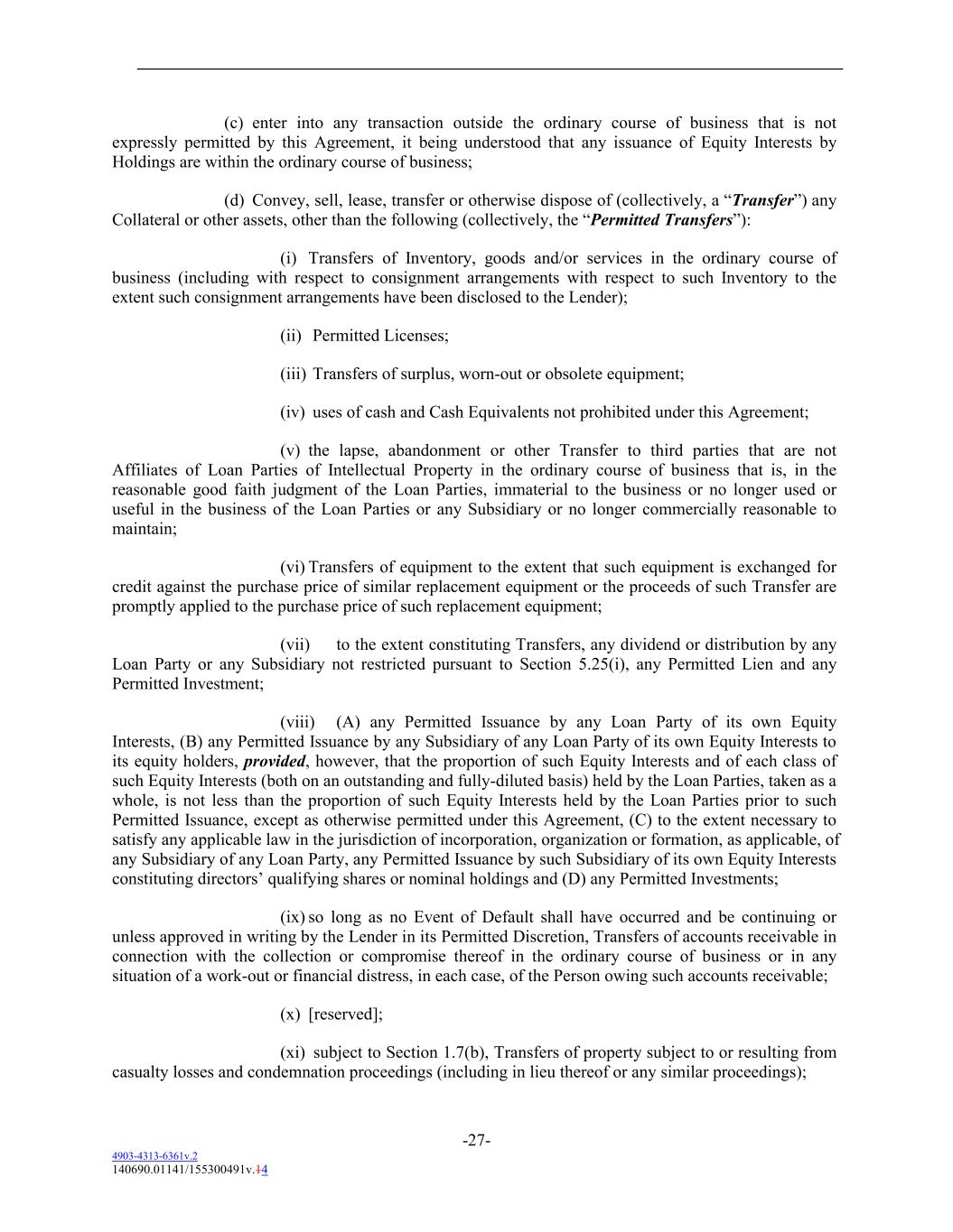 (c) enter into any transaction outside the ordinary course of business that is not expressly permitted by this Agreement, it being understood that any issuance of Equity Interests by Holdings are within the ordinary course of business; (d) Convey, sell, lease, transfer or otherwise dispose of (collectively, a “Transfer”) any Collateral or other assets, other than the following (collectively, the “Permitted Transfers”): (i) Transfers of Inventory, goods and/or services in the ordinary course of business (including with respect to consignment arrangements with respect to such Inventory to the extent such consignment arrangements have been disclosed to the Lender); (ii) Permitted Licenses; (iii) Transfers of surplus, worn-out or obsolete equipment; (iv) uses of cash and Cash Equivalents not prohibited under this Agreement; (v) the lapse, abandonment or other Transfer to third parties that are not Affiliates of Loan Parties of Intellectual Property in the ordinary course of business that is, in the reasonable good faith judgment of the Loan Parties, immaterial to the business or no longer used or useful in the business of the Loan Parties or any Subsidiary or no longer commercially reasonable to maintain; (vi) Transfers of equipment to the extent that such equipment is exchanged for credit against the purchase price of similar replacement equipment or the proceeds of such Transfer are promptly applied to the purchase price of such replacement equipment; (vii) to the extent constituting Transfers, any dividend or distribution by any Loan Party or any Subsidiary not restricted pursuant to Section 5.25(i), any Permitted Lien and any Permitted Investment; (viii) (A) any Permitted Issuance by any Loan Party of its own Equity Interests, (B) any Permitted Issuance by any Subsidiary of any Loan Party of its own Equity Interests to its equity holders, provided, however, that the proportion of such Equity Interests and of each class of such Equity Interests (both on an outstanding and fully-diluted basis) held by the Loan Parties, taken as a whole, is not less than the proportion of such Equity Interests held by the Loan Parties prior to such Permitted Issuance, except as otherwise permitted under this Agreement, (C) to the extent necessary to satisfy any applicable law in the jurisdiction of incorporation, organization or formation, as applicable, of any Subsidiary of any Loan Party, any Permitted Issuance by such Subsidiary of its own Equity Interests constituting directors’ qualifying shares or nominal holdings and (D) any Permitted Investments; (ix) so long as no Event of Default shall have occurred and be continuing or unless approved in writing by the Lender in its Permitted Discretion, Transfers of accounts receivable in connection with the collection or compromise thereof in the ordinary course of business or in any situation of a work-out or financial distress, in each case, of the Person owing such accounts receivable; (x) [reserved]; (xi) subject to Section 1.7(b), Transfers of property subject to or resulting from casualty losses and condemnation proceedings (including in lieu thereof or any similar proceedings); -27- 4903-4313-6361v.2 140690.01141/155300491v.14