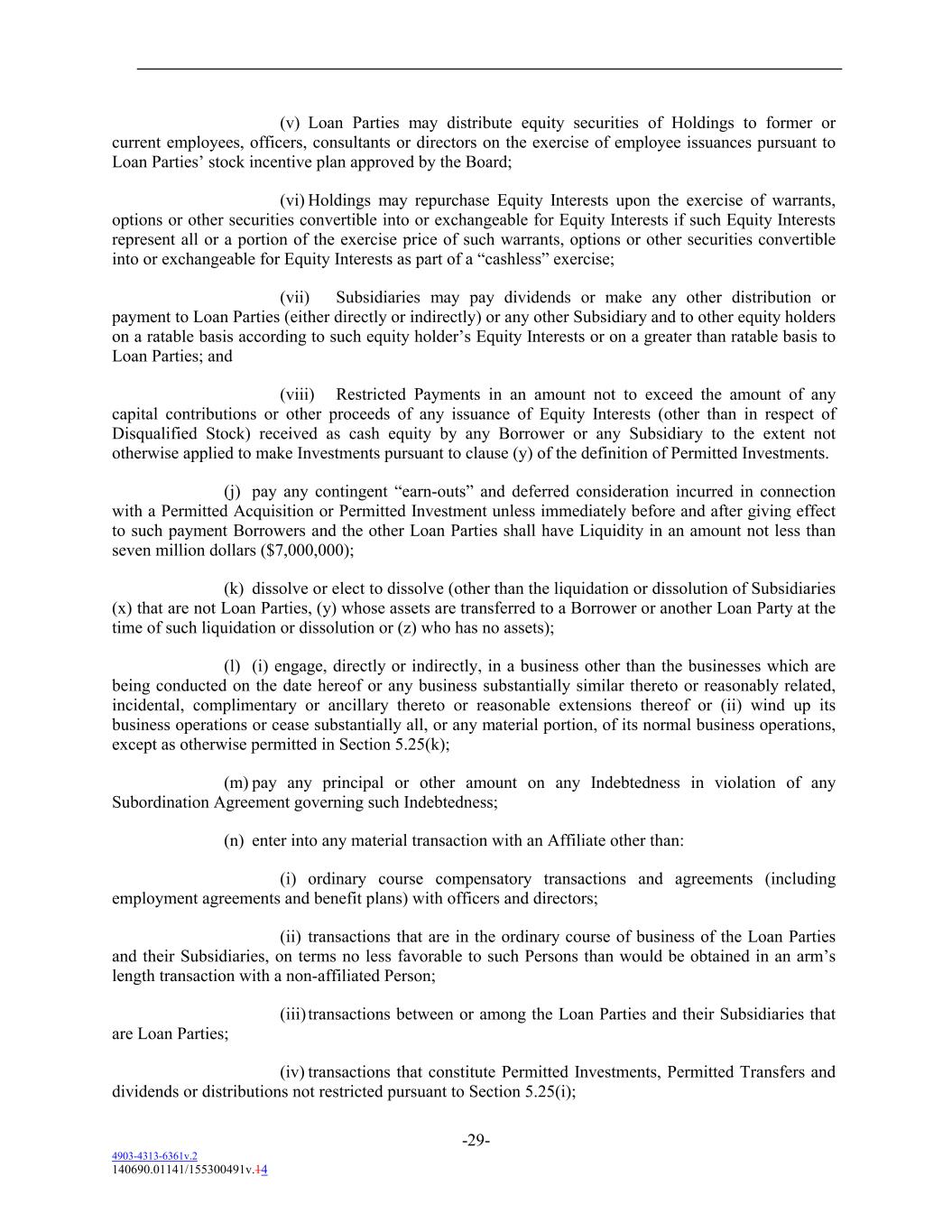 (v) Loan Parties may distribute equity securities of Holdings to former or current employees, officers, consultants or directors on the exercise of employee issuances pursuant to Loan Parties’ stock incentive plan approved by the Board; (vi) Holdings may repurchase Equity Interests upon the exercise of warrants, options or other securities convertible into or exchangeable for Equity Interests if such Equity Interests represent all or a portion of the exercise price of such warrants, options or other securities convertible into or exchangeable for Equity Interests as part of a “cashless” exercise; (vii) Subsidiaries may pay dividends or make any other distribution or payment to Loan Parties (either directly or indirectly) or any other Subsidiary and to other equity holders on a ratable basis according to such equity holder’s Equity Interests or on a greater than ratable basis to Loan Parties; and (viii) Restricted Payments in an amount not to exceed the amount of any capital contributions or other proceeds of any issuance of Equity Interests (other than in respect of Disqualified Stock) received as cash equity by any Borrower or any Subsidiary to the extent not otherwise applied to make Investments pursuant to clause (y) of the definition of Permitted Investments. (j) pay any contingent “earn-outs” and deferred consideration incurred in connection with a Permitted Acquisition or Permitted Investment unless immediately before and after giving effect to such payment Borrowers and the other Loan Parties shall have Liquidity in an amount not less than seven million dollars ($7,000,000); (k) dissolve or elect to dissolve (other than the liquidation or dissolution of Subsidiaries (x) that are not Loan Parties, (y) whose assets are transferred to a Borrower or another Loan Party at the time of such liquidation or dissolution or (z) who has no assets); (l) (i) engage, directly or indirectly, in a business other than the businesses which are being conducted on the date hereof or any business substantially similar thereto or reasonably related, incidental, complimentary or ancillary thereto or reasonable extensions thereof or (ii) wind up its business operations or cease substantially all, or any material portion, of its normal business operations, except as otherwise permitted in Section 5.25(k); (m) pay any principal or other amount on any Indebtedness in violation of any Subordination Agreement governing such Indebtedness; (n) enter into any material transaction with an Affiliate other than: (i) ordinary course compensatory transactions and agreements (including employment agreements and benefit plans) with officers and directors; (ii) transactions that are in the ordinary course of business of the Loan Parties and their Subsidiaries, on terms no less favorable to such Persons than would be obtained in an arm’s length transaction with a non-affiliated Person; (iii) transactions between or among the Loan Parties and their Subsidiaries that are Loan Parties; (iv) transactions that constitute Permitted Investments, Permitted Transfers and dividends or distributions not restricted pursuant to Section 5.25(i); -29- 4903-4313-6361v.2 140690.01141/155300491v.14