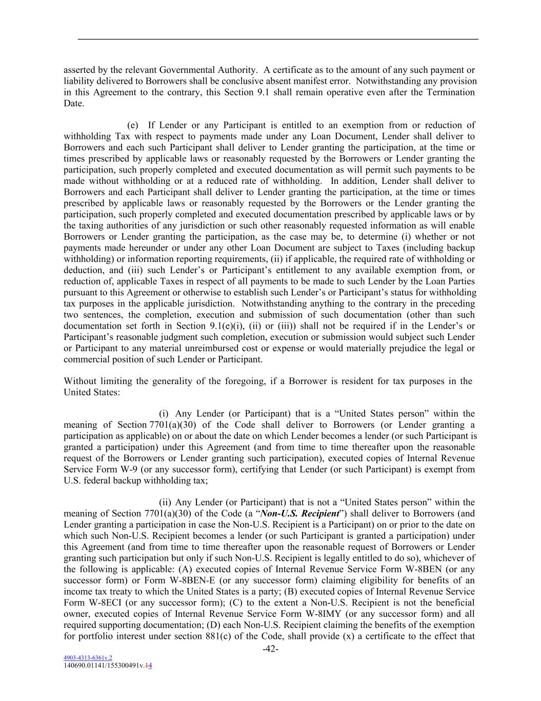 asserted by the relevant Governmental Authority. A certificate as to the amount of any such payment or liability delivered to Borrowers shall be conclusive absent manifest error. Notwithstanding any provision in this Agreement to the contrary, this Section 9.1 shall remain operative even after the Termination Date. (e) If Lender or any Participant is entitled to an exemption from or reduction of withholding Tax with respect to payments made under any Loan Document, Lender shall deliver to Borrowers and each such Participant shall deliver to Lender granting the participation, at the time or times prescribed by applicable laws or reasonably requested by the Borrowers or Lender granting the participation, such properly completed and executed documentation as will permit such payments to be made without withholding or at a reduced rate of withholding. In addition, Lender shall deliver to Borrowers and each Participant shall deliver to Lender granting the participation, at the time or times prescribed by applicable laws or reasonably requested by the Borrowers or the Lender granting the participation, such properly completed and executed documentation prescribed by applicable laws or by the taxing authorities of any jurisdiction or such other reasonably requested information as will enable Borrowers or Lender granting the participation, as the case may be, to determine (i) whether or not payments made hereunder or under any other Loan Document are subject to Taxes (including backup withholding) or information reporting requirements, (ii) if applicable, the required rate of withholding or deduction, and (iii) such Lender’s or Participant’s entitlement to any available exemption from, or reduction of, applicable Taxes in respect of all payments to be made to such Lender by the Loan Parties pursuant to this Agreement or otherwise to establish such Lender’s or Participant’s status for withholding tax purposes in the applicable jurisdiction. Notwithstanding anything to the contrary in the preceding two sentences, the completion, execution and submission of such documentation (other than such documentation set forth in Section 9.1(e)(i), (ii) or (iii)) shall not be required if in the Lender’s or Participant’s reasonable judgment such completion, execution or submission would subject such Lender or Participant to any material unreimbursed cost or expense or would materially prejudice the legal or commercial position of such Lender or Participant. Without limiting the generality of the foregoing, if a Borrower is resident for tax purposes in the United States: (i) Any Lender (or Participant) that is a “United States person” within the meaning of Section 7701(a)(30) of the Code shall deliver to Borrowers (or Lender granting a participation as applicable) on or about the date on which Lender becomes a lender (or such Participant is granted a participation) under this Agreement (and from time to time thereafter upon the reasonable request of the Borrowers or Lender granting such participation), executed copies of Internal Revenue Service Form W-9 (or any successor form), certifying that Lender (or such Participant) is exempt from U.S. federal backup withholding tax; (ii) Any Lender (or Participant) that is not a “United States person” within the meaning of Section 7701(a)(30) of the Code (a “Non-U.S. Recipient”) shall deliver to Borrowers (and Lender granting a participation in case the Non-U.S. Recipient is a Participant) on or prior to the date on which such Non-U.S. Recipient becomes a lender (or such Participant is granted a participation) under this Agreement (and from time to time thereafter upon the reasonable request of Borrowers or Lender granting such participation but only if such Non-U.S. Recipient is legally entitled to do so), whichever of the following is applicable: (A) executed copies of Internal Revenue Service Form W-8BEN (or any successor form) or Form W-8BEN-E (or any successor form) claiming eligibility for benefits of an income tax treaty to which the United States is a party; (B) executed copies of Internal Revenue Service Form W-8ECI (or any successor form); (C) to the extent a Non-U.S. Recipient is not the beneficial owner, executed copies of Internal Revenue Service Form W-8IMY (or any successor form) and all required supporting documentation; (D) each Non-U.S. Recipient claiming the benefits of the exemption for portfolio interest under section 881(c) of the Code, shall provide (x) a certificate to the effect that -42- 4903-4313-6361v.2 140690.01141/155300491v.14