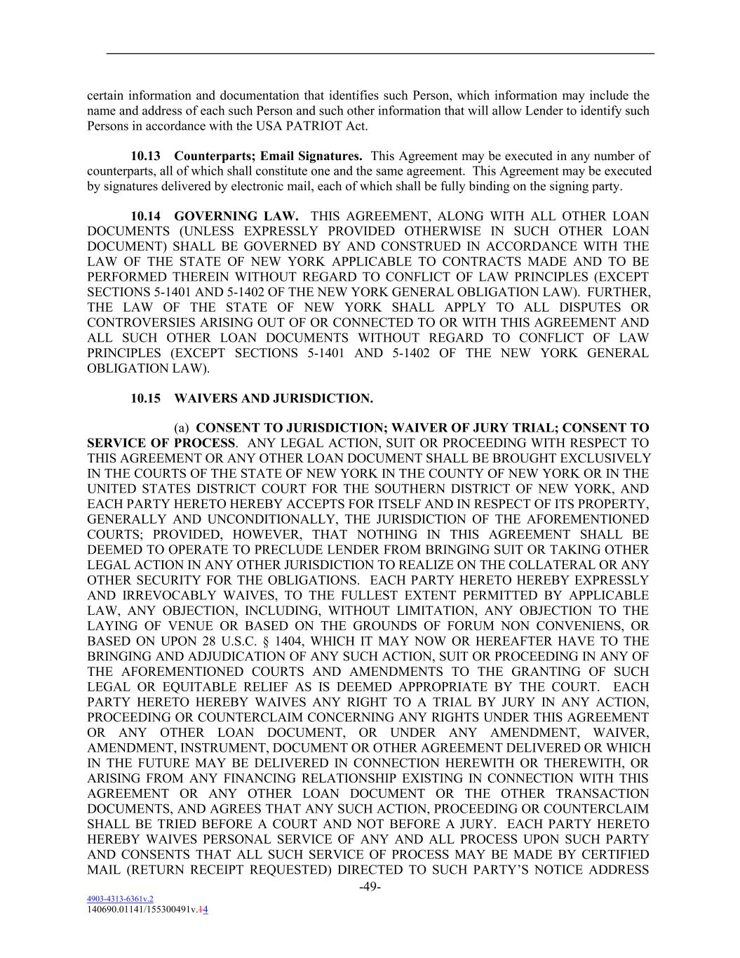 certain information and documentation that identifies such Person, which information may include the name and address of each such Person and such other information that will allow Lender to identify such Persons in accordance with the USA PATRIOT Act. 10.13 Counterparts; Email Signatures. This Agreement may be executed in any number of counterparts, all of which shall constitute one and the same agreement. This Agreement may be executed by signatures delivered by electronic mail, each of which shall be fully binding on the signing party. 10.14 GOVERNING LAW. THIS AGREEMENT, ALONG WITH ALL OTHER LOAN DOCUMENTS (UNLESS EXPRESSLY PROVIDED OTHERWISE IN SUCH OTHER LOAN DOCUMENT) SHALL BE GOVERNED BY AND CONSTRUED IN ACCORDANCE WITH THE LAW OF THE STATE OF NEW YORK APPLICABLE TO CONTRACTS MADE AND TO BE PERFORMED THEREIN WITHOUT REGARD TO CONFLICT OF LAW PRINCIPLES (EXCEPT SECTIONS 5-1401 AND 5-1402 OF THE NEW YORK GENERAL OBLIGATION LAW). FURTHER, THE LAW OF THE STATE OF NEW YORK SHALL APPLY TO ALL DISPUTES OR CONTROVERSIES ARISING OUT OF OR CONNECTED TO OR WITH THIS AGREEMENT AND ALL SUCH OTHER LOAN DOCUMENTS WITHOUT REGARD TO CONFLICT OF LAW PRINCIPLES (EXCEPT SECTIONS 5-1401 AND 5-1402 OF THE NEW YORK GENERAL OBLIGATION LAW). 10.15 WAIVERS AND JURISDICTION. (a) CONSENT TO JURISDICTION; WAIVER OF JURY TRIAL; CONSENT TO SERVICE OF PROCESS. ANY LEGAL ACTION, SUIT OR PROCEEDING WITH RESPECT TO THIS AGREEMENT OR ANY OTHER LOAN DOCUMENT SHALL BE BROUGHT EXCLUSIVELY IN THE COURTS OF THE STATE OF NEW YORK IN THE COUNTY OF NEW YORK OR IN THE UNITED STATES DISTRICT COURT FOR THE SOUTHERN DISTRICT OF NEW YORK, AND EACH PARTY HERETO HEREBY ACCEPTS FOR ITSELF AND IN RESPECT OF ITS PROPERTY, GENERALLY AND UNCONDITIONALLY, THE JURISDICTION OF THE AFOREMENTIONED COURTS; PROVIDED, HOWEVER, THAT NOTHING IN THIS AGREEMENT SHALL BE DEEMED TO OPERATE TO PRECLUDE LENDER FROM BRINGING SUIT OR TAKING OTHER LEGAL ACTION IN ANY OTHER JURISDICTION TO REALIZE ON THE COLLATERAL OR ANY OTHER SECURITY FOR THE OBLIGATIONS. EACH PARTY HERETO HEREBY EXPRESSLY AND IRREVOCABLY WAIVES, TO THE FULLEST EXTENT PERMITTED BY APPLICABLE LAW, ANY OBJECTION, INCLUDING, WITHOUT LIMITATION, ANY OBJECTION TO THE LAYING OF VENUE OR BASED ON THE GROUNDS OF FORUM NON CONVENIENS, OR BASED ON UPON 28 U.S.C. § 1404, WHICH IT MAY NOW OR HEREAFTER HAVE TO THE BRINGING AND ADJUDICATION OF ANY SUCH ACTION, SUIT OR PROCEEDING IN ANY OF THE AFOREMENTIONED COURTS AND AMENDMENTS TO THE GRANTING OF SUCH LEGAL OR EQUITABLE RELIEF AS IS DEEMED APPROPRIATE BY THE COURT. EACH PARTY HERETO HEREBY WAIVES ANY RIGHT TO A TRIAL BY JURY IN ANY ACTION, PROCEEDING OR COUNTERCLAIM CONCERNING ANY RIGHTS UNDER THIS AGREEMENT OR ANY OTHER LOAN DOCUMENT, OR UNDER ANY AMENDMENT, WAIVER, AMENDMENT, INSTRUMENT, DOCUMENT OR OTHER AGREEMENT DELIVERED OR WHICH IN THE FUTURE MAY BE DELIVERED IN CONNECTION HEREWITH OR THEREWITH, OR ARISING FROM ANY FINANCING RELATIONSHIP EXISTING IN CONNECTION WITH THIS AGREEMENT OR ANY OTHER LOAN DOCUMENT OR THE OTHER TRANSACTION DOCUMENTS, AND AGREES THAT ANY SUCH ACTION, PROCEEDING OR COUNTERCLAIM SHALL BE TRIED BEFORE A COURT AND NOT BEFORE A JURY. EACH PARTY HERETO HEREBY WAIVES PERSONAL SERVICE OF ANY AND ALL PROCESS UPON SUCH PARTY AND CONSENTS THAT ALL SUCH SERVICE OF PROCESS MAY BE MADE BY CERTIFIED MAIL (RETURN RECEIPT REQUESTED) DIRECTED TO SUCH PARTY’S NOTICE ADDRESS -49- 4903-4313-6361v.2 140690.01141/155300491v.14