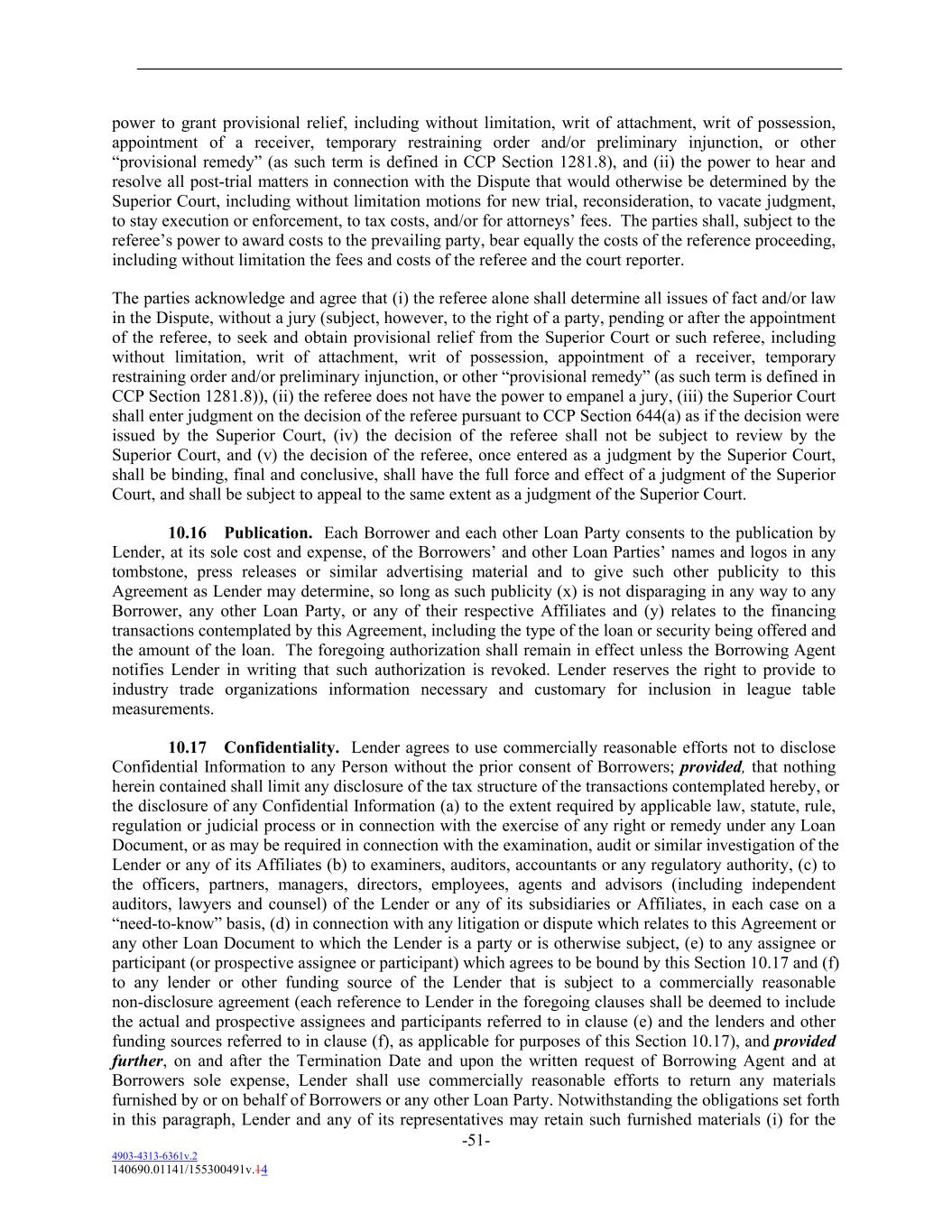 power to grant provisional relief, including without limitation, writ of attachment, writ of possession, appointment of a receiver, temporary restraining order and/or preliminary injunction, or other “provisional remedy” (as such term is defined in CCP Section 1281.8), and (ii) the power to hear and resolve all post-trial matters in connection with the Dispute that would otherwise be determined by the Superior Court, including without limitation motions for new trial, reconsideration, to vacate judgment, to stay execution or enforcement, to tax costs, and/or for attorneys’ fees. The parties shall, subject to the referee’s power to award costs to the prevailing party, bear equally the costs of the reference proceeding, including without limitation the fees and costs of the referee and the court reporter. The parties acknowledge and agree that (i) the referee alone shall determine all issues of fact and/or law in the Dispute, without a jury (subject, however, to the right of a party, pending or after the appointment of the referee, to seek and obtain provisional relief from the Superior Court or such referee, including without limitation, writ of attachment, writ of possession, appointment of a receiver, temporary restraining order and/or preliminary injunction, or other “provisional remedy” (as such term is defined in CCP Section 1281.8)), (ii) the referee does not have the power to empanel a jury, (iii) the Superior Court shall enter judgment on the decision of the referee pursuant to CCP Section 644(a) as if the decision were issued by the Superior Court, (iv) the decision of the referee shall not be subject to review by the Superior Court, and (v) the decision of the referee, once entered as a judgment by the Superior Court, shall be binding, final and conclusive, shall have the full force and effect of a judgment of the Superior Court, and shall be subject to appeal to the same extent as a judgment of the Superior Court. 10.16 Publication. Each Borrower and each other Loan Party consents to the publication by Lender, at its sole cost and expense, of the Borrowers’ and other Loan Parties’ names and logos in any tombstone, press releases or similar advertising material and to give such other publicity to this Agreement as Lender may determine, so long as such publicity (x) is not disparaging in any way to any Borrower, any other Loan Party, or any of their respective Affiliates and (y) relates to the financing transactions contemplated by this Agreement, including the type of the loan or security being offered and the amount of the loan. The foregoing authorization shall remain in effect unless the Borrowing Agent notifies Lender in writing that such authorization is revoked. Lender reserves the right to provide to industry trade organizations information necessary and customary for inclusion in league table measurements. 10.17 Confidentiality. Lender agrees to use commercially reasonable efforts not to disclose Confidential Information to any Person without the prior consent of Borrowers; provided, that nothing herein contained shall limit any disclosure of the tax structure of the transactions contemplated hereby, or the disclosure of any Confidential Information (a) to the extent required by applicable law, statute, rule, regulation or judicial process or in connection with the exercise of any right or remedy under any Loan Document, or as may be required in connection with the examination, audit or similar investigation of the Lender or any of its Affiliates (b) to examiners, auditors, accountants or any regulatory authority, (c) to the officers, partners, managers, directors, employees, agents and advisors (including independent auditors, lawyers and counsel) of the Lender or any of its subsidiaries or Affiliates, in each case on a “need-to-know” basis, (d) in connection with any litigation or dispute which relates to this Agreement or any other Loan Document to which the Lender is a party or is otherwise subject, (e) to any assignee or participant (or prospective assignee or participant) which agrees to be bound by this Section 10.17 and (f) to any lender or other funding source of the Lender that is subject to a commercially reasonable non-disclosure agreement (each reference to Lender in the foregoing clauses shall be deemed to include the actual and prospective assignees and participants referred to in clause (e) and the lenders and other funding sources referred to in clause (f), as applicable for purposes of this Section 10.17), and provided further, on and after the Termination Date and upon the written request of Borrowing Agent and at Borrowers sole expense, Lender shall use commercially reasonable efforts to return any materials furnished by or on behalf of Borrowers or any other Loan Party. Notwithstanding the obligations set forth in this paragraph, Lender and any of its representatives may retain such furnished materials (i) for the -51- 4903-4313-6361v.2 140690.01141/155300491v.14
