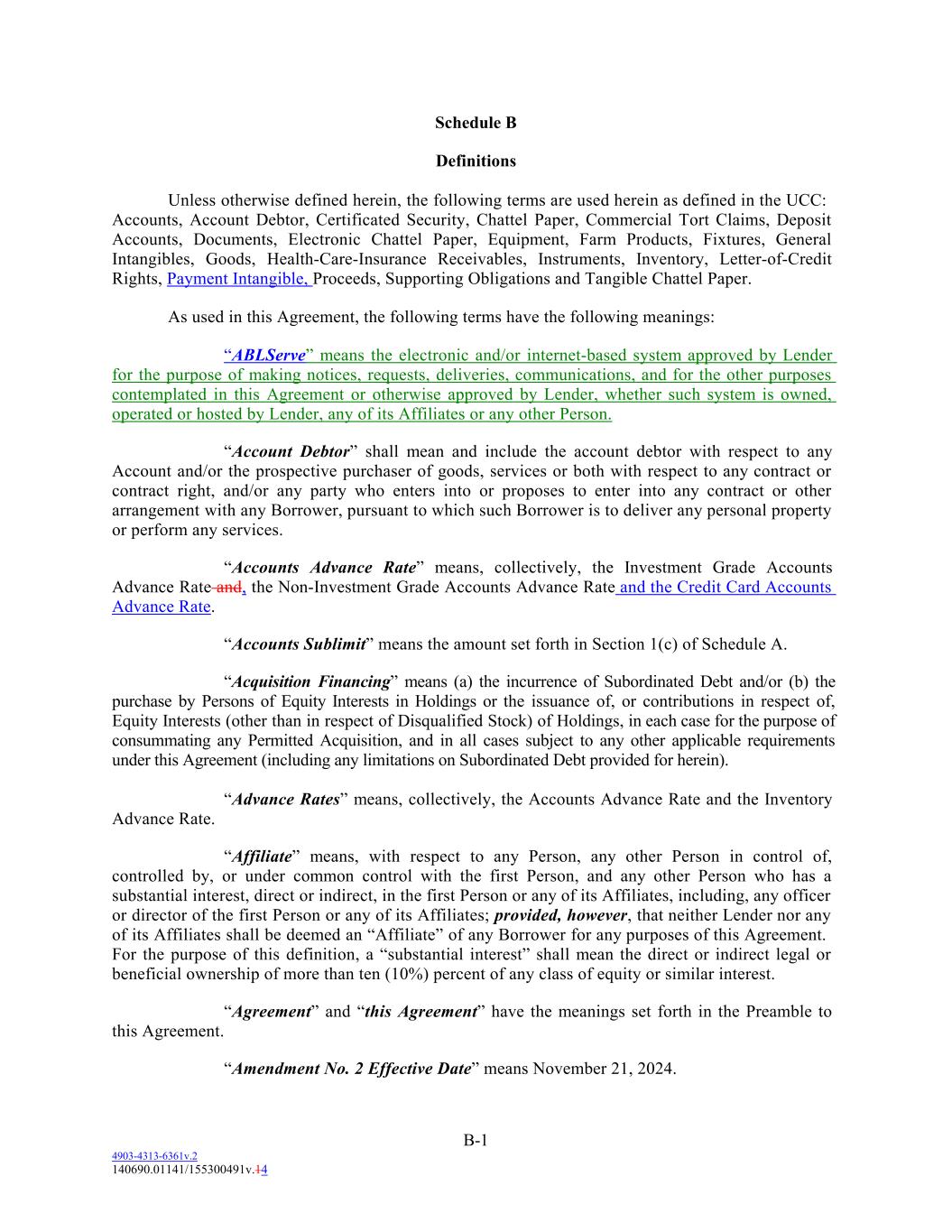 Schedule B Definitions Unless otherwise defined herein, the following terms are used herein as defined in the UCC: Accounts, Account Debtor, Certificated Security, Chattel Paper, Commercial Tort Claims, Deposit Accounts, Documents, Electronic Chattel Paper, Equipment, Farm Products, Fixtures, General Intangibles, Goods, Health-Care-Insurance Receivables, Instruments, Inventory, Letter-of-Credit Rights, Payment Intangible, Proceeds, Supporting Obligations and Tangible Chattel Paper. As used in this Agreement, the following terms have the following meanings: “ABLServe” means the electronic and/or internet-based system approved by Lender for the purpose of making notices, requests, deliveries, communications, and for the other purposes contemplated in this Agreement or otherwise approved by Lender, whether such system is owned, operated or hosted by Lender, any of its Affiliates or any other Person. “Account Debtor” shall mean and include the account debtor with respect to any Account and/or the prospective purchaser of goods, services or both with respect to any contract or contract right, and/or any party who enters into or proposes to enter into any contract or other arrangement with any Borrower, pursuant to which such Borrower is to deliver any personal property or perform any services. “Accounts Advance Rate” means, collectively, the Investment Grade Accounts Advance Rate and, the Non-Investment Grade Accounts Advance Rate and the Credit Card Accounts Advance Rate. “Accounts Sublimit” means the amount set forth in Section 1(c) of Schedule A. “Acquisition Financing” means (a) the incurrence of Subordinated Debt and/or (b) the purchase by Persons of Equity Interests in Holdings or the issuance of, or contributions in respect of, Equity Interests (other than in respect of Disqualified Stock) of Holdings, in each case for the purpose of consummating any Permitted Acquisition, and in all cases subject to any other applicable requirements under this Agreement (including any limitations on Subordinated Debt provided for herein). “Advance Rates” means, collectively, the Accounts Advance Rate and the Inventory Advance Rate. “Affiliate” means, with respect to any Person, any other Person in control of, controlled by, or under common control with the first Person, and any other Person who has a substantial interest, direct or indirect, in the first Person or any of its Affiliates, including, any officer or director of the first Person or any of its Affiliates; provided, however, that neither Lender nor any of its Affiliates shall be deemed an “Affiliate” of any Borrower for any purposes of this Agreement. For the purpose of this definition, a “substantial interest” shall mean the direct or indirect legal or beneficial ownership of more than ten (10%) percent of any class of equity or similar interest. “Agreement” and “this Agreement” have the meanings set forth in the Preamble to this Agreement. “Amendment No. 2 Effective Date” means November 21, 2024. B-1 4903-4313-6361v.2 140690.01141/155300491v.14