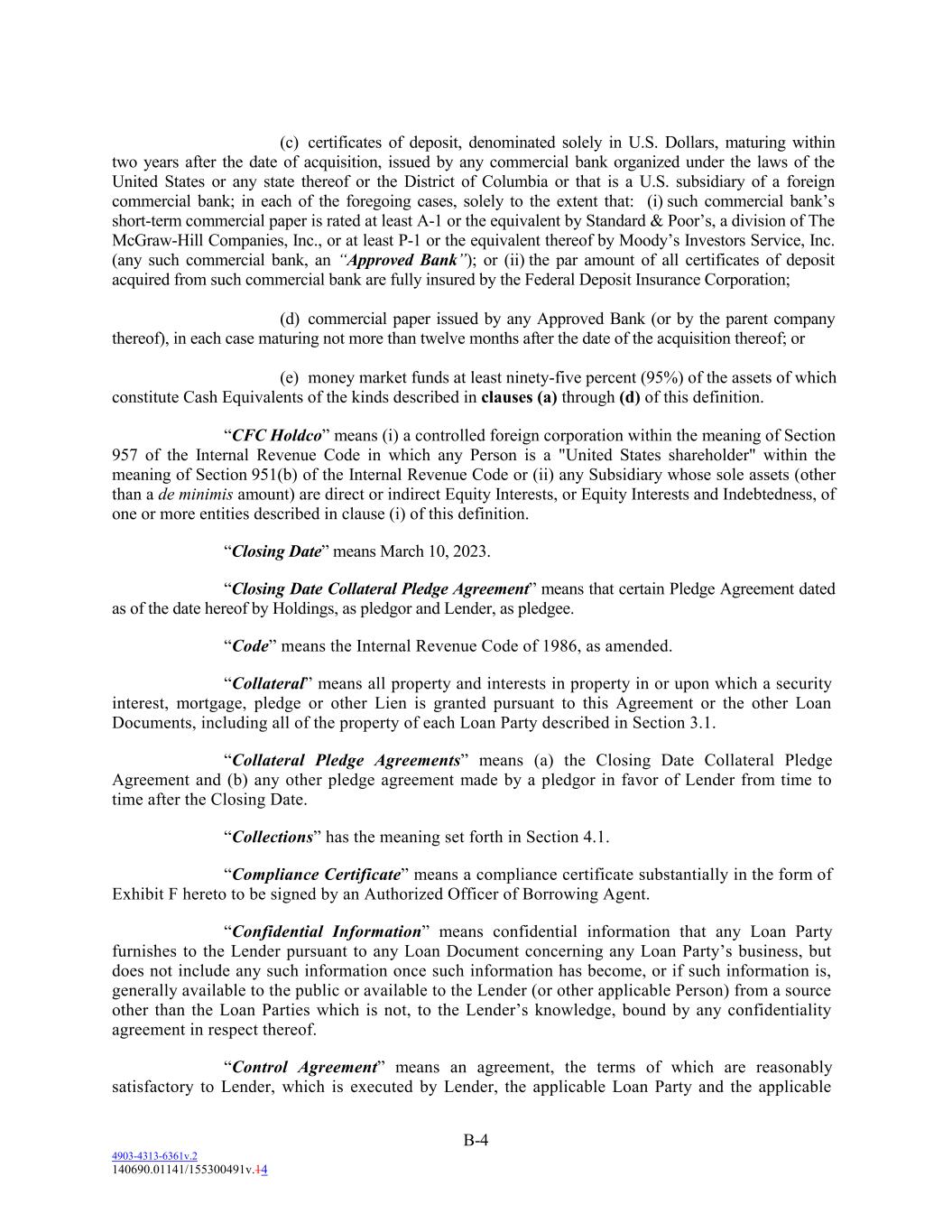 (c) certificates of deposit, denominated solely in U.S. Dollars, maturing within two years after the date of acquisition, issued by any commercial bank organized under the laws of the United States or any state thereof or the District of Columbia or that is a U.S. subsidiary of a foreign commercial bank; in each of the foregoing cases, solely to the extent that: (i) such commercial bank’s short-term commercial paper is rated at least A-1 or the equivalent by Standard & Poor’s, a division of The McGraw-Hill Companies, Inc., or at least P-1 or the equivalent thereof by Moody’s Investors Service, Inc. (any such commercial bank, an “Approved Bank”); or (ii) the par amount of all certificates of deposit acquired from such commercial bank are fully insured by the Federal Deposit Insurance Corporation; (d) commercial paper issued by any Approved Bank (or by the parent company thereof), in each case maturing not more than twelve months after the date of the acquisition thereof; or (e) money market funds at least ninety-five percent (95%) of the assets of which constitute Cash Equivalents of the kinds described in clauses (a) through (d) of this definition. “CFC Holdco” means (i) a controlled foreign corporation within the meaning of Section 957 of the Internal Revenue Code in which any Person is a "United States shareholder" within the meaning of Section 951(b) of the Internal Revenue Code or (ii) any Subsidiary whose sole assets (other than a de minimis amount) are direct or indirect Equity Interests, or Equity Interests and Indebtedness, of one or more entities described in clause (i) of this definition. “Closing Date” means March 10, 2023. “Closing Date Collateral Pledge Agreement” means that certain Pledge Agreement dated as of the date hereof by Holdings, as pledgor and Lender, as pledgee. “Code” means the Internal Revenue Code of 1986, as amended. “Collateral” means all property and interests in property in or upon which a security interest, mortgage, pledge or other Lien is granted pursuant to this Agreement or the other Loan Documents, including all of the property of each Loan Party described in Section 3.1. “Collateral Pledge Agreements” means (a) the Closing Date Collateral Pledge Agreement and (b) any other pledge agreement made by a pledgor in favor of Lender from time to time after the Closing Date. “Collections” has the meaning set forth in Section 4.1. “Compliance Certificate” means a compliance certificate substantially in the form of Exhibit F hereto to be signed by an Authorized Officer of Borrowing Agent. “Confidential Information” means confidential information that any Loan Party furnishes to the Lender pursuant to any Loan Document concerning any Loan Party’s business, but does not include any such information once such information has become, or if such information is, generally available to the public or available to the Lender (or other applicable Person) from a source other than the Loan Parties which is not, to the Lender’s knowledge, bound by any confidentiality agreement in respect thereof. “Control Agreement” means an agreement, the terms of which are reasonably satisfactory to Lender, which is executed by Lender, the applicable Loan Party and the applicable B-4 4903-4313-6361v.2 140690.01141/155300491v.14