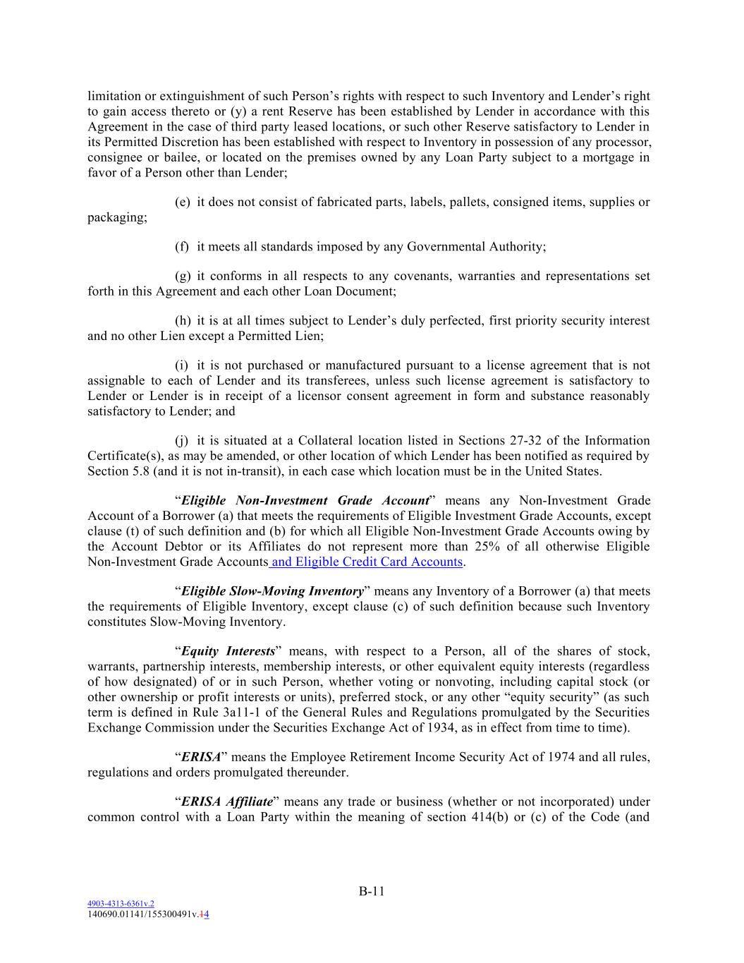 limitation or extinguishment of such Person’s rights with respect to such Inventory and Lender’s right to gain access thereto or (y) a rent Reserve has been established by Lender in accordance with this Agreement in the case of third party leased locations, or such other Reserve satisfactory to Lender in its Permitted Discretion has been established with respect to Inventory in possession of any processor, consignee or bailee, or located on the premises owned by any Loan Party subject to a mortgage in favor of a Person other than Lender; (e) it does not consist of fabricated parts, labels, pallets, consigned items, supplies or packaging; (f) it meets all standards imposed by any Governmental Authority; (g) it conforms in all respects to any covenants, warranties and representations set forth in this Agreement and each other Loan Document; (h) it is at all times subject to Lender’s duly perfected, first priority security interest and no other Lien except a Permitted Lien; (i) it is not purchased or manufactured pursuant to a license agreement that is not assignable to each of Lender and its transferees, unless such license agreement is satisfactory to Lender or Lender is in receipt of a licensor consent agreement in form and substance reasonably satisfactory to Lender; and (j) it is situated at a Collateral location listed in Sections 27-32 of the Information Certificate(s), as may be amended, or other location of which Lender has been notified as required by Section 5.8 (and it is not in-transit), in each case which location must be in the United States. “Eligible Non-Investment Grade Account” means any Non-Investment Grade Account of a Borrower (a) that meets the requirements of Eligible Investment Grade Accounts, except clause (t) of such definition and (b) for which all Eligible Non-Investment Grade Accounts owing by the Account Debtor or its Affiliates do not represent more than 25% of all otherwise Eligible Non-Investment Grade Accounts and Eligible Credit Card Accounts. “Eligible Slow-Moving Inventory” means any Inventory of a Borrower (a) that meets the requirements of Eligible Inventory, except clause (c) of such definition because such Inventory constitutes Slow-Moving Inventory. “Equity Interests” means, with respect to a Person, all of the shares of stock, warrants, partnership interests, membership interests, or other equivalent equity interests (regardless of how designated) of or in such Person, whether voting or nonvoting, including capital stock (or other ownership or profit interests or units), preferred stock, or any other “equity security” (as such term is defined in Rule 3a11-1 of the General Rules and Regulations promulgated by the Securities Exchange Commission under the Securities Exchange Act of 1934, as in effect from time to time). “ERISA” means the Employee Retirement Income Security Act of 1974 and all rules, regulations and orders promulgated thereunder. “ERISA Affiliate” means any trade or business (whether or not incorporated) under common control with a Loan Party within the meaning of section 414(b) or (c) of the Code (and B-11 4903-4313-6361v.2 140690.01141/155300491v.14