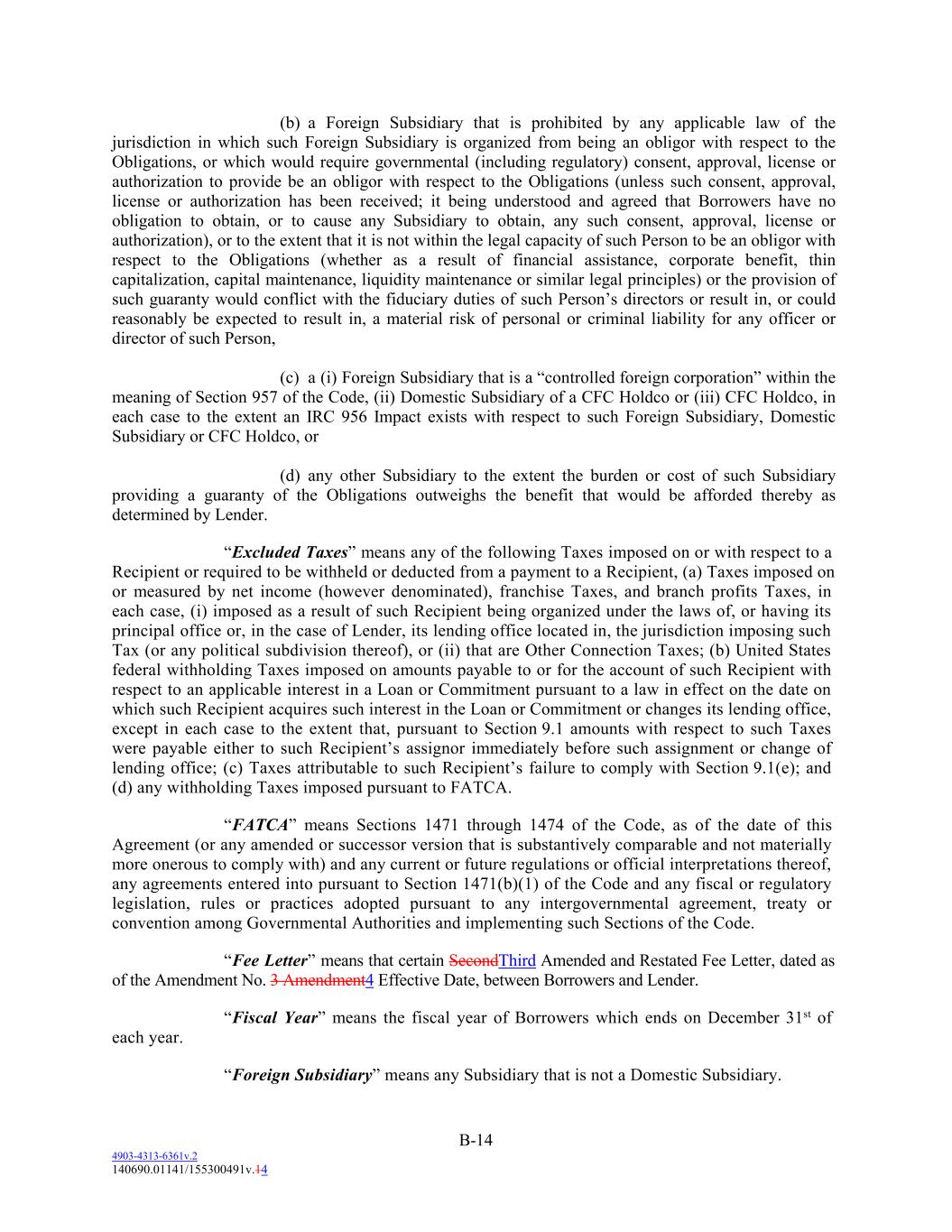 (b) a Foreign Subsidiary that is prohibited by any applicable law of the jurisdiction in which such Foreign Subsidiary is organized from being an obligor with respect to the Obligations, or which would require governmental (including regulatory) consent, approval, license or authorization to provide be an obligor with respect to the Obligations (unless such consent, approval, license or authorization has been received; it being understood and agreed that Borrowers have no obligation to obtain, or to cause any Subsidiary to obtain, any such consent, approval, license or authorization), or to the extent that it is not within the legal capacity of such Person to be an obligor with respect to the Obligations (whether as a result of financial assistance, corporate benefit, thin capitalization, capital maintenance, liquidity maintenance or similar legal principles) or the provision of such guaranty would conflict with the fiduciary duties of such Person’s directors or result in, or could reasonably be expected to result in, a material risk of personal or criminal liability for any officer or director of such Person, (c) a (i) Foreign Subsidiary that is a “controlled foreign corporation” within the meaning of Section 957 of the Code, (ii) Domestic Subsidiary of a CFC Holdco or (iii) CFC Holdco, in each case to the extent an IRC 956 Impact exists with respect to such Foreign Subsidiary, Domestic Subsidiary or CFC Holdco, or (d) any other Subsidiary to the extent the burden or cost of such Subsidiary providing a guaranty of the Obligations outweighs the benefit that would be afforded thereby as determined by Lender. “Excluded Taxes” means any of the following Taxes imposed on or with respect to a Recipient or required to be withheld or deducted from a payment to a Recipient, (a) Taxes imposed on or measured by net income (however denominated), franchise Taxes, and branch profits Taxes, in each case, (i) imposed as a result of such Recipient being organized under the laws of, or having its principal office or, in the case of Lender, its lending office located in, the jurisdiction imposing such Tax (or any political subdivision thereof), or (ii) that are Other Connection Taxes; (b) United States federal withholding Taxes imposed on amounts payable to or for the account of such Recipient with respect to an applicable interest in a Loan or Commitment pursuant to a law in effect on the date on which such Recipient acquires such interest in the Loan or Commitment or changes its lending office, except in each case to the extent that, pursuant to Section 9.1 amounts with respect to such Taxes were payable either to such Recipient’s assignor immediately before such assignment or change of lending office; (c) Taxes attributable to such Recipient’s failure to comply with Section 9.1(e); and (d) any withholding Taxes imposed pursuant to FATCA. “FATCA” means Sections 1471 through 1474 of the Code, as of the date of this Agreement (or any amended or successor version that is substantively comparable and not materially more onerous to comply with) and any current or future regulations or official interpretations thereof, any agreements entered into pursuant to Section 1471(b)(1) of the Code and any fiscal or regulatory legislation, rules or practices adopted pursuant to any intergovernmental agreement, treaty or convention among Governmental Authorities and implementing such Sections of the Code. “Fee Letter” means that certain SecondThird Amended and Restated Fee Letter, dated as of the Amendment No. 3 Amendment4 Effective Date, between Borrowers and Lender. “Fiscal Year” means the fiscal year of Borrowers which ends on December 31st of each year. “Foreign Subsidiary” means any Subsidiary that is not a Domestic Subsidiary. B-14 4903-4313-6361v.2 140690.01141/155300491v.14
