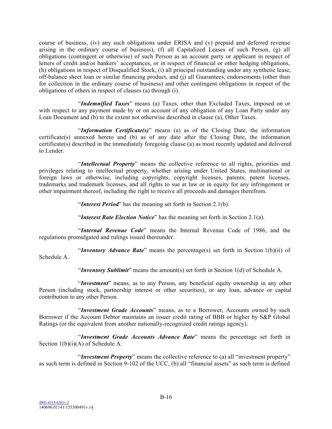 course of business, (iv) any such obligations under ERISA and (v) prepaid and deferred revenue arising in the ordinary course of business), (f) all Capitalized Leases of such Person, (g) all obligations (contingent or otherwise) of such Person as an account party or applicant in respect of letters of credit and/or bankers’ acceptances, or in respect of financial or other hedging obligations, (h) obligations in respect of Disqualified Stock, (i) all principal outstanding under any synthetic lease, off-balance sheet loan or similar financing product, and (j) all Guarantees, endorsements (other than for collection in the ordinary course of business) and other contingent obligations in respect of the obligations of others in respect of clauses (a) through (i). “Indemnified Taxes” means (a) Taxes, other than Excluded Taxes, imposed on or with respect to any payment made by or on account of any obligation of any Loan Party under any Loan Document and (b) to the extent not otherwise described in clause (a), Other Taxes. “Information Certificate(s)” means (a) as of the Closing Date, the information certificate(s) annexed hereto and (b) as of any date after the Closing Date, the information certificate(s) described in the immediately foregoing clause (a) as most recently updated and delivered to Lender. “Intellectual Property” means the collective reference to all rights, priorities and privileges relating to intellectual property, whether arising under United States, multinational or foreign laws or otherwise, including copyrights, copyright licenses, patents, patent licenses, trademarks and trademark licenses, and all rights to sue at law or in equity for any infringement or other impairment thereof, including the right to receive all proceeds and damages therefrom. “Interest Period” has the meaning set forth in Section 2.1(b). “Interest Rate Election Notice” has the meaning set forth in Section 2.1(a). “Internal Revenue Code” means the Internal Revenue Code of 1986, and the regulations promulgated and rulings issued thereunder. “Inventory Advance Rate” means the percentage(s) set forth in Section 1(b)(ii) of Schedule A. “Inventory Sublimit” means the amount(s) set forth in Section 1(d) of Schedule A. “Investment” means, as to any Person, any beneficial equity ownership in any other Person (including stock, partnership interest or other securities), or any loan, advance or capital contribution to any other Person. “Investment Grade Accounts” means, as to a Borrower, Accounts owned by such Borrower if the Account Debtor maintains an issuer credit rating of BBB or higher by S&P Global Ratings (or the equivalent from another nationally-recognized credit ratings agency). “Investment Grade Accounts Advance Rate” means the percentage set forth in Section 1(b)(i)(A) of Schedule A. “Investment Property” means the collective reference to (a) all “investment property” as such term is defined in Section 9-102 of the UCC, (b) all “financial assets” as such term is defined B-16 4903-4313-6361v.2 140690.01141/155300491v.14