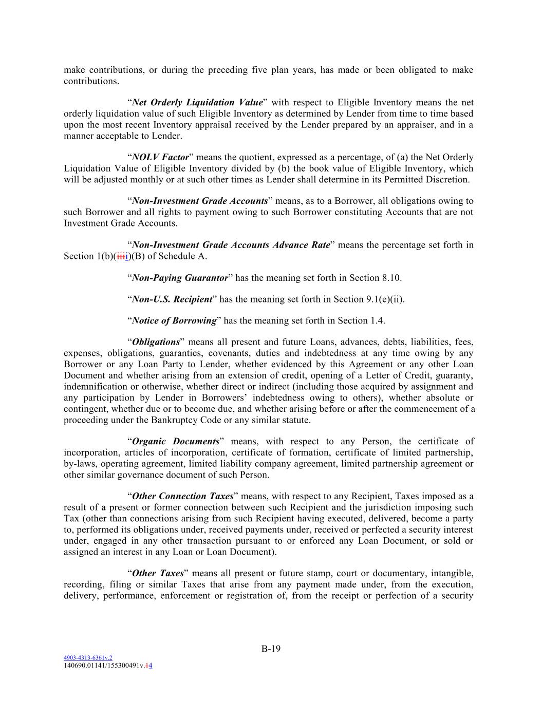 make contributions, or during the preceding five plan years, has made or been obligated to make contributions. “Net Orderly Liquidation Value” with respect to Eligible Inventory means the net orderly liquidation value of such Eligible Inventory as determined by Lender from time to time based upon the most recent Inventory appraisal received by the Lender prepared by an appraiser, and in a manner acceptable to Lender. “NOLV Factor” means the quotient, expressed as a percentage, of (a) the Net Orderly Liquidation Value of Eligible Inventory divided by (b) the book value of Eligible Inventory, which will be adjusted monthly or at such other times as Lender shall determine in its Permitted Discretion. “Non-Investment Grade Accounts” means, as to a Borrower, all obligations owing to such Borrower and all rights to payment owing to such Borrower constituting Accounts that are not Investment Grade Accounts. “Non-Investment Grade Accounts Advance Rate” means the percentage set forth in Section 1(b)(iiii)(B) of Schedule A. “Non-Paying Guarantor” has the meaning set forth in Section 8.10. “Non-U.S. Recipient” has the meaning set forth in Section 9.1(e)(ii). “Notice of Borrowing” has the meaning set forth in Section 1.4. “Obligations” means all present and future Loans, advances, debts, liabilities, fees, expenses, obligations, guaranties, covenants, duties and indebtedness at any time owing by any Borrower or any Loan Party to Lender, whether evidenced by this Agreement or any other Loan Document and whether arising from an extension of credit, opening of a Letter of Credit, guaranty, indemnification or otherwise, whether direct or indirect (including those acquired by assignment and any participation by Lender in Borrowers’ indebtedness owing to others), whether absolute or contingent, whether due or to become due, and whether arising before or after the commencement of a proceeding under the Bankruptcy Code or any similar statute. “Organic Documents” means, with respect to any Person, the certificate of incorporation, articles of incorporation, certificate of formation, certificate of limited partnership, by-laws, operating agreement, limited liability company agreement, limited partnership agreement or other similar governance document of such Person. “Other Connection Taxes” means, with respect to any Recipient, Taxes imposed as a result of a present or former connection between such Recipient and the jurisdiction imposing such Tax (other than connections arising from such Recipient having executed, delivered, become a party to, performed its obligations under, received payments under, received or perfected a security interest under, engaged in any other transaction pursuant to or enforced any Loan Document, or sold or assigned an interest in any Loan or Loan Document). “Other Taxes” means all present or future stamp, court or documentary, intangible, recording, filing or similar Taxes that arise from any payment made under, from the execution, delivery, performance, enforcement or registration of, from the receipt or perfection of a security B-19 4903-4313-6361v.2 140690.01141/155300491v.14