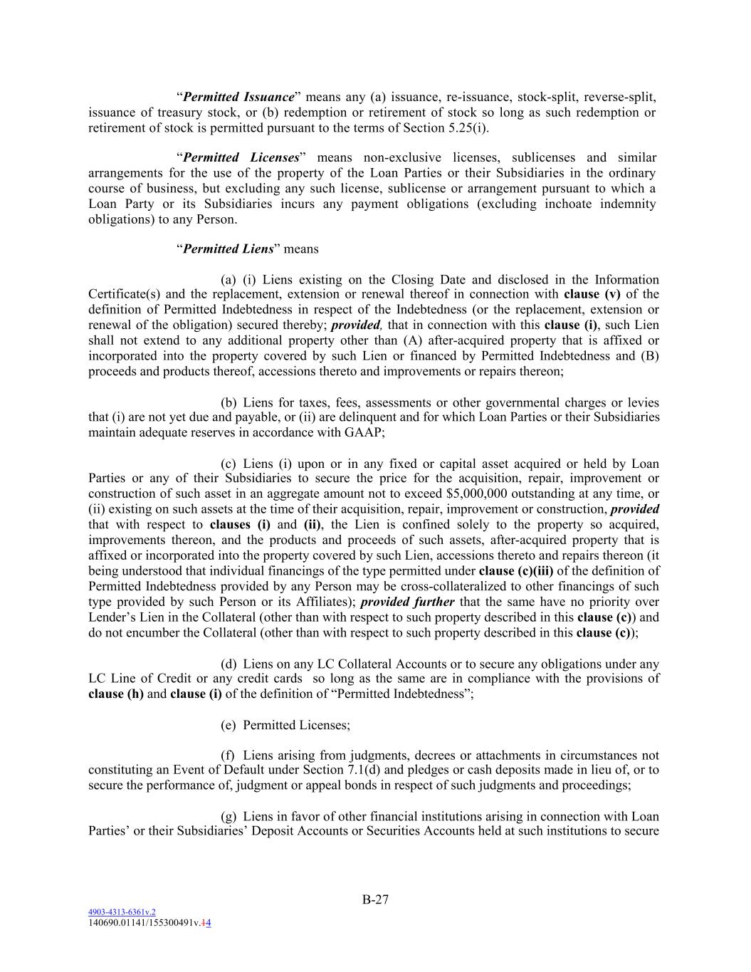 “Permitted Issuance” means any (a) issuance, re-issuance, stock-split, reverse-split, issuance of treasury stock, or (b) redemption or retirement of stock so long as such redemption or retirement of stock is permitted pursuant to the terms of Section 5.25(i). “Permitted Licenses” means non-exclusive licenses, sublicenses and similar arrangements for the use of the property of the Loan Parties or their Subsidiaries in the ordinary course of business, but excluding any such license, sublicense or arrangement pursuant to which a Loan Party or its Subsidiaries incurs any payment obligations (excluding inchoate indemnity obligations) to any Person. “Permitted Liens” means (a) (i) Liens existing on the Closing Date and disclosed in the Information Certificate(s) and the replacement, extension or renewal thereof in connection with clause (v) of the definition of Permitted Indebtedness in respect of the Indebtedness (or the replacement, extension or renewal of the obligation) secured thereby; provided, that in connection with this clause (i), such Lien shall not extend to any additional property other than (A) after-acquired property that is affixed or incorporated into the property covered by such Lien or financed by Permitted Indebtedness and (B) proceeds and products thereof, accessions thereto and improvements or repairs thereon; (b) Liens for taxes, fees, assessments or other governmental charges or levies that (i) are not yet due and payable, or (ii) are delinquent and for which Loan Parties or their Subsidiaries maintain adequate reserves in accordance with GAAP; (c) Liens (i) upon or in any fixed or capital asset acquired or held by Loan Parties or any of their Subsidiaries to secure the price for the acquisition, repair, improvement or construction of such asset in an aggregate amount not to exceed $5,000,000 outstanding at any time, or (ii) existing on such assets at the time of their acquisition, repair, improvement or construction, provided that with respect to clauses (i) and (ii), the Lien is confined solely to the property so acquired, improvements thereon, and the products and proceeds of such assets, after-acquired property that is affixed or incorporated into the property covered by such Lien, accessions thereto and repairs thereon (it being understood that individual financings of the type permitted under clause (c)(iii) of the definition of Permitted Indebtedness provided by any Person may be cross-collateralized to other financings of such type provided by such Person or its Affiliates); provided further that the same have no priority over Lender’s Lien in the Collateral (other than with respect to such property described in this clause (c)) and do not encumber the Collateral (other than with respect to such property described in this clause (c)); (d) Liens on any LC Collateral Accounts or to secure any obligations under any LC Line of Credit or any credit cards so long as the same are in compliance with the provisions of clause (h) and clause (i) of the definition of “Permitted Indebtedness”; (e) Permitted Licenses; (f) Liens arising from judgments, decrees or attachments in circumstances not constituting an Event of Default under Section 7.1(d) and pledges or cash deposits made in lieu of, or to secure the performance of, judgment or appeal bonds in respect of such judgments and proceedings; (g) Liens in favor of other financial institutions arising in connection with Loan Parties’ or their Subsidiaries’ Deposit Accounts or Securities Accounts held at such institutions to secure B-27 4903-4313-6361v.2 140690.01141/155300491v.14