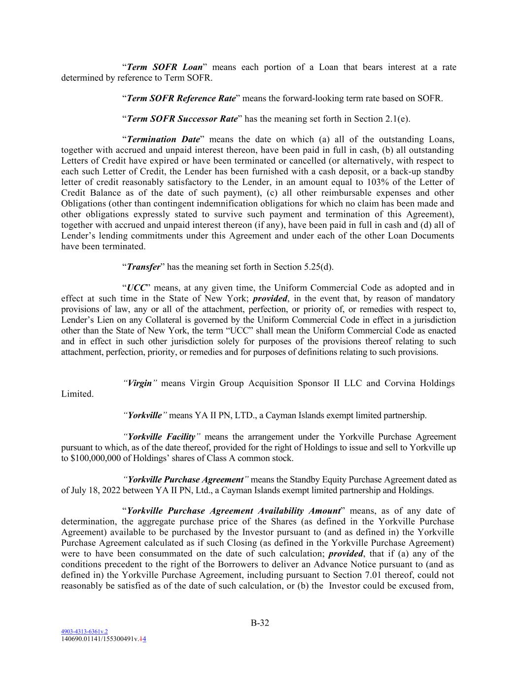 “Term SOFR Loan” means each portion of a Loan that bears interest at a rate determined by reference to Term SOFR. “Term SOFR Reference Rate” means the forward-looking term rate based on SOFR. “Term SOFR Successor Rate” has the meaning set forth in Section 2.1(e). “Termination Date” means the date on which (a) all of the outstanding Loans, together with accrued and unpaid interest thereon, have been paid in full in cash, (b) all outstanding Letters of Credit have expired or have been terminated or cancelled (or alternatively, with respect to each such Letter of Credit, the Lender has been furnished with a cash deposit, or a back-up standby letter of credit reasonably satisfactory to the Lender, in an amount equal to 103% of the Letter of Credit Balance as of the date of such payment), (c) all other reimbursable expenses and other Obligations (other than contingent indemnification obligations for which no claim has been made and other obligations expressly stated to survive such payment and termination of this Agreement), together with accrued and unpaid interest thereon (if any), have been paid in full in cash and (d) all of Lender’s lending commitments under this Agreement and under each of the other Loan Documents have been terminated. “Transfer” has the meaning set forth in Section 5.25(d). “UCC” means, at any given time, the Uniform Commercial Code as adopted and in effect at such time in the State of New York; provided, in the event that, by reason of mandatory provisions of law, any or all of the attachment, perfection, or priority of, or remedies with respect to, Lender’s Lien on any Collateral is governed by the Uniform Commercial Code in effect in a jurisdiction other than the State of New York, the term “UCC” shall mean the Uniform Commercial Code as enacted and in effect in such other jurisdiction solely for purposes of the provisions thereof relating to such attachment, perfection, priority, or remedies and for purposes of definitions relating to such provisions. “Virgin” means Virgin Group Acquisition Sponsor II LLC and Corvina Holdings Limited. “Yorkville” means YA II PN, LTD., a Cayman Islands exempt limited partnership. “Yorkville Facility” means the arrangement under the Yorkville Purchase Agreement pursuant to which, as of the date thereof, provided for the right of Holdings to issue and sell to Yorkville up to $100,000,000 of Holdings’ shares of Class A common stock. “Yorkville Purchase Agreement” means the Standby Equity Purchase Agreement dated as of July 18, 2022 between YA II PN, Ltd., a Cayman Islands exempt limited partnership and Holdings. “Yorkville Purchase Agreement Availability Amount” means, as of any date of determination, the aggregate purchase price of the Shares (as defined in the Yorkville Purchase Agreement) available to be purchased by the Investor pursuant to (and as defined in) the Yorkville Purchase Agreement calculated as if such Closing (as defined in the Yorkville Purchase Agreement) were to have been consummated on the date of such calculation; provided, that if (a) any of the conditions precedent to the right of the Borrowers to deliver an Advance Notice pursuant to (and as defined in) the Yorkville Purchase Agreement, including pursuant to Section 7.01 thereof, could not reasonably be satisfied as of the date of such calculation, or (b) the Investor could be excused from, B-32 4903-4313-6361v.2 140690.01141/155300491v.14