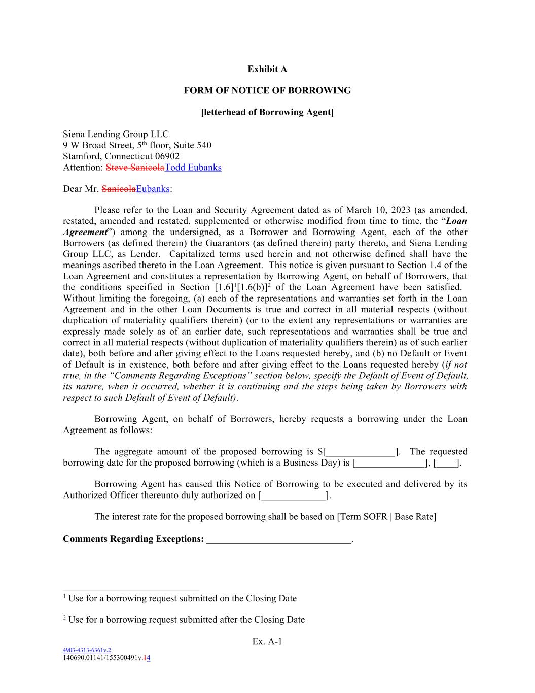Ex. A-1 4903-4313-6361v.2 140690.01141/155300491v.14 Please refer to the Loan and Security Agreement dated as of March 10, 2023 (as amended, restated, amended and restated, supplemented or otherwise modified from time to time, the “Loan Agreement”) among the undersigned, as a Borrower and Borrowing Agent, each of the other Borrowers (as defined therein) the Guarantors (as defined therein) party thereto, and Siena Lending Group LLC, as Lender. Capitalized terms used herein and not otherwise defined shall have the meanings ascribed thereto in the Loan Agreement. This notice is given pursuant to Section 1.4 of the Loan Agreement and constitutes a representation by Borrowing Agent, on behalf of Borrowers, that the conditions specified in Section [1.6]1[1.6(b)]2 of the Loan Agreement have been satisfied. Without limiting the foregoing, (a) each of the representations and warranties set forth in the Loan Agreement and in the other Loan Documents is true and correct in all material respects (without duplication of materiality qualifiers therein) (or to the extent any representations or warranties are expressly made solely as of an earlier date, such representations and warranties shall be true and correct in all material respects (without duplication of materiality qualifiers therein) as of such earlier date), both before and after giving effect to the Loans requested hereby, and (b) no Default or Event of Default is in existence, both before and after giving effect to the Loans requested hereby (if not true, in the “Comments Regarding Exceptions” section below, specify the Default of Event of Default, its nature, when it occurred, whether it is continuing and the steps being taken by Borrowers with respect to such Default of Event of Default). Borrowing Agent, on behalf of Borrowers, hereby requests a borrowing under the Loan Agreement as follows: The aggregate amount of the proposed borrowing is $[______________]. The requested borrowing date for the proposed borrowing (which is a Business Day) is [______________], [____]. Borrowing Agent has caused this Notice of Borrowing to be executed and delivered by its Authorized Officer thereunto duly authorized on [_____________]. The interest rate for the proposed borrowing shall be based on [Term SOFR | Base Rate] Comments Regarding Exceptions: ______________________________. Exhibit A FORM OF NOTICE OF BORROWING [letterhead of Borrowing Agent] Siena Lending Group LLC 9 W Broad Street, 5th floor, Suite 540 Stamford, Connecticut 06902 Attention: Steve SanicolaTodd Eubanks Dear Mr. SanicolaEubanks: 1 Use for a borrowing request submitted on the Closing Date 2 Use for a borrowing request submitted after the Closing Date