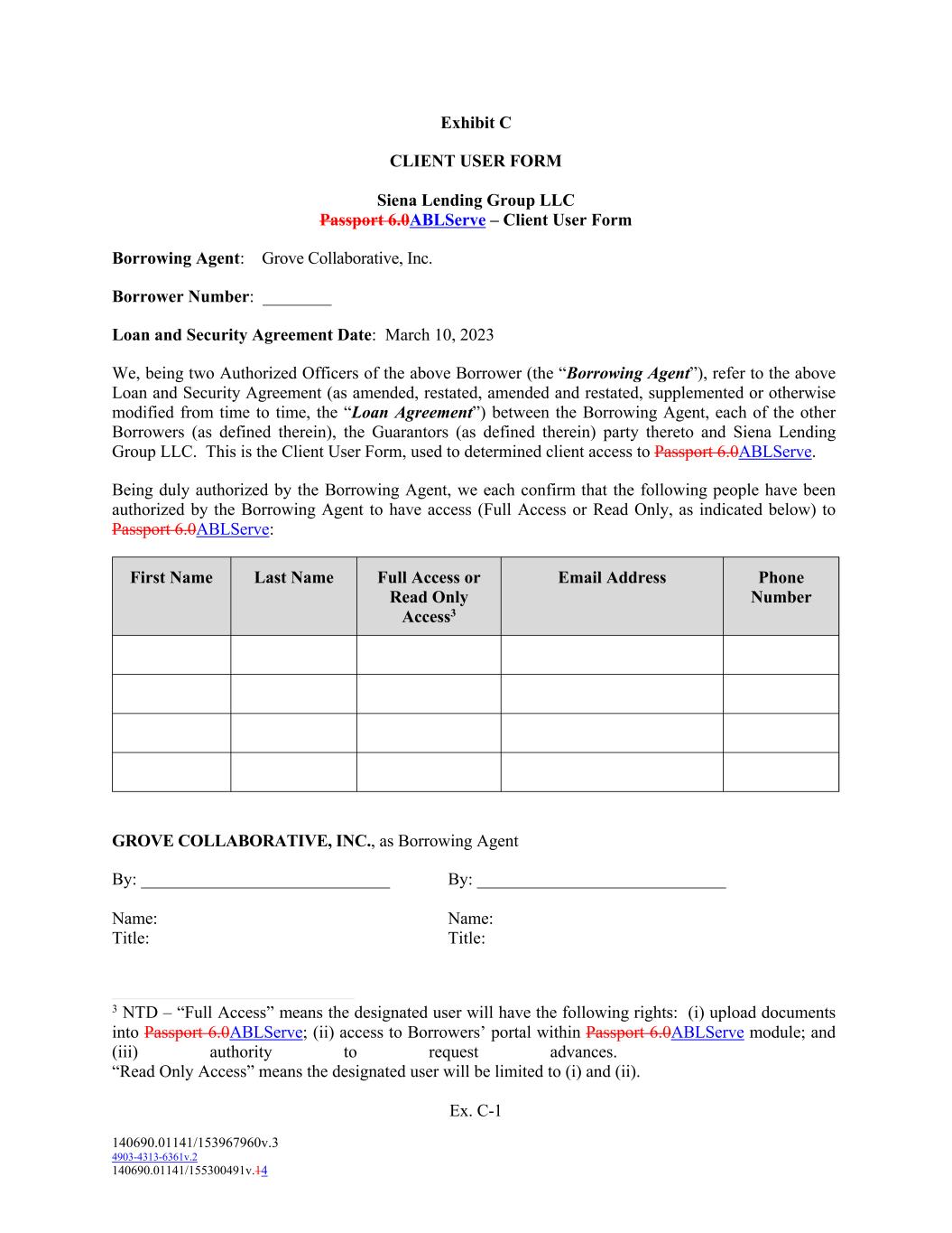 Ex. C-1 140690.01141/153967960v.3 4903-4313-6361v.2 140690.01141/155300491v.14 Phone Number First Name Last Name Exhibit C CLIENT USER FORM Siena Lending Group LLC Passport 6.0ABLServe – Client User Form Borrowing Agent: Grove Collaborative, Inc. Borrower Number: ________ Loan and Security Agreement Date: March 10, 2023 We, being two Authorized Officers of the above Borrower (the “Borrowing Agent”), refer to the above Loan and Security Agreement (as amended, restated, amended and restated, supplemented or otherwise modified from time to time, the “Loan Agreement”) between the Borrowing Agent, each of the other Borrowers (as defined therein), the Guarantors (as defined therein) party thereto and Siena Lending Group LLC. This is the Client User Form, used to determined client access to Passport 6.0ABLServe. Being duly authorized by the Borrowing Agent, we each confirm that the following people have been authorized by the Borrowing Agent to have access (Full Access or Read Only, as indicated below) to Passport 6.0ABLServe: Full Access or Read Only Access3 Email Address GROVE COLLABORATIVE, INC., as Borrowing Agent By: _____________________________ By: _____________________________ Name: Name: Title: Title: 3 NTD – “Full Access” means the designated user will have the following rights: (i) upload documents into Passport 6.0ABLServe; (ii) access to Borrowers’ portal within Passport 6.0ABLServe module; and (iii) authority to request advances. “Read Only Access” means the designated user will be limited to (i) and (ii).