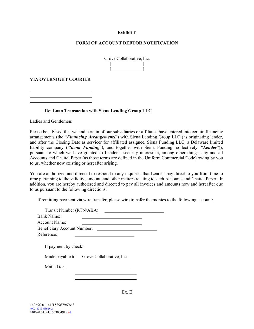 Exhibit E FORM OF ACCOUNT DEBTOR NOTIFICATION Grove Collaborative, Inc. [______________] [______________] VIA OVERNIGHT COURIER ___________________________ ___________________________ ___________________________ Re: Loan Transaction with Siena Lending Group LLC Ladies and Gentlemen: Please be advised that we and certain of our subsidiaries or affiliates have entered into certain financing arrangements (the “Financing Arrangements”) with Siena Lending Group LLC (as originating lender, and after the Closing Date as servicer for affiliated assignee, Siena Funding LLC, a Delaware limited liability company (“Siena Funding”), and together with Siena Funding, collectively, “Lender”)), pursuant to which we have granted to Lender a security interest in, among other things, any and all Accounts and Chattel Paper (as those terms are defined in the Uniform Commercial Code) owing by you to us, whether now existing or hereafter arising. You are authorized and directed to respond to any inquiries that Lender may direct to you from time to time pertaining to the validity, amount, and other matters relating to such Accounts and Chattel Paper. In addition, you are hereby authorized and directed to pay all invoices and amounts now and hereafter due to us pursuant to the following directions: If remitting payment via wire transfer, please wire transfer the monies to the following account: Transit Number (RTN/ABA): __________________________ Bank Name: __________________________ Account Name: __________________________ Beneficiary Account Number: __________________________ Reference: __________________________ If payment by check: Made payable to: Grove Collaborative, Inc. Mailed to: ___________________________ ___________________________ ___________________________ Ex. E 140690.01141/153967960v.3 4903-4313-6361v.2 140690.01141/155300491v.14