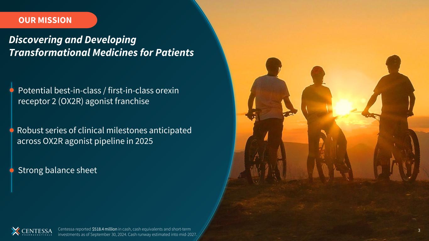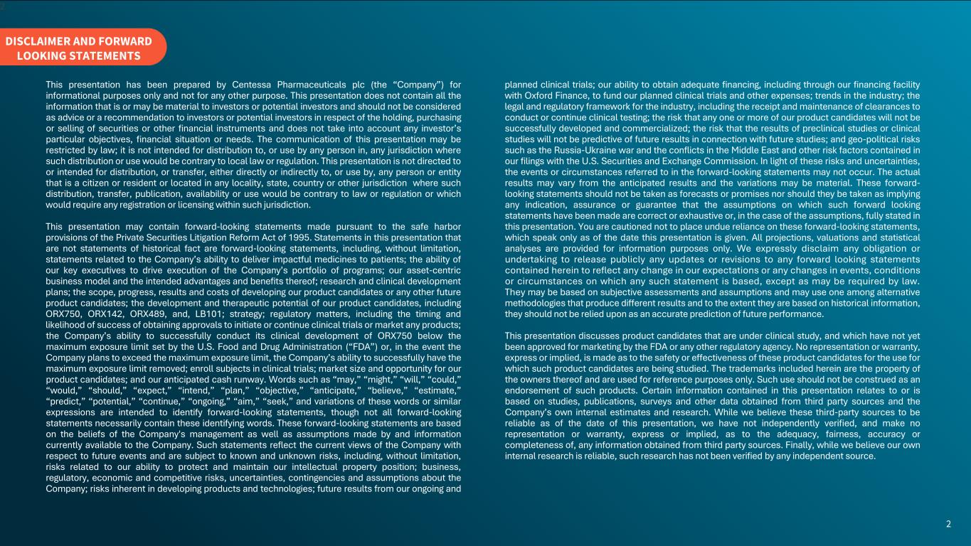 2 DISCLAIMER AND FORWARD LOOKING STATEMENTS 2 This presentation has been prepared by Centessa Pharmaceuticals plc (the “Company”) for informational purposes only and not for any other purpose. This presentation does not contain all the information that is or may be material to investors or potential investors and should not be considered as advice or a recommendation to investors or potential investors in respect of the holding, purchasing or selling of securities or other financial instruments and does not take into account any investor’s particular objectives, financial situation or needs. The communication of this presentation may be restricted by law; it is not intended for distribution to, or use by any person in, any jurisdiction where such distribution or use would be contrary to local law or regulation. This presentation is not directed to or intended for distribution, or transfer, either directly or indirectly to, or use by, any person or entity that is a citizen or resident or located in any locality, state, country or other jurisdiction where such distribution, transfer, publication, availability or use would be contrary to law or regulation or which would require any registration or licensing within such jurisdiction. This presentation may contain forward-looking statements made pursuant to the safe harbor provisions of the Private Securities Litigation Reform Act of 1995. Statements in this presentation that are not statements of historical fact are forward-looking statements, including, without limitation, statements related to the Company’s ability to deliver impactful medicines to patients; the ability of our key executives to drive execution of the Company’s portfolio of programs; our asset-centric business model and the intended advantages and benefits thereof; research and clinical development plans; the scope, progress, results and costs of developing our product candidates or any other future product candidates; the development and therapeutic potential of our product candidates, including ORX750, ORX142, ORX489, and, LB101; strategy; regulatory matters, including the timing and likelihood of success of obtaining approvals to initiate or continue clinical trials or market any products; the Company’s ability to successfully conduct its clinical development of ORX750 below the maximum exposure limit set by the U.S. Food and Drug Administration (“FDA”) or, in the event the Company plans to exceed the maximum exposure limit, the Company’s ability to successfully have the maximum exposure limit removed; enroll subjects in clinical trials; market size and opportunity for our product candidates; and our anticipated cash runway. Words such as “may,” “might,” “will,” “could,” “would,” “should,” “expect,” “intend,” “plan,” “objective,” “anticipate,” “believe,” “estimate,” “predict,” “potential,” “continue,” “ongoing,” “aim,” “seek,” and variations of these words or similar expressions are intended to identify forward-looking statements, though not all forward-looking statements necessarily contain these identifying words. These forward-looking statements are based on the beliefs of the Company's management as well as assumptions made by and information currently available to the Company. Such statements reflect the current views of the Company with respect to future events and are subject to known and unknown risks, including, without limitation, risks related to our ability to protect and maintain our intellectual property position; business, regulatory, economic and competitive risks, uncertainties, contingencies and assumptions about the Company; risks inherent in developing products and technologies; future results from our ongoing and planned clinical trials; our ability to obtain adequate financing, including through our financing facility with Oxford Finance, to fund our planned clinical trials and other expenses; trends in the industry; the legal and regulatory framework for the industry, including the receipt and maintenance of clearances to conduct or continue clinical testing; the risk that any one or more of our product candidates will not be successfully developed and commercialized; the risk that the results of preclinical studies or clinical studies will not be predictive of future results in connection with future studies; and geo-political risks such as the Russia-Ukraine war and the conflicts in the Middle East and other risk factors contained in our filings with the U.S. Securities and Exchange Commission. In light of these risks and uncertainties, the events or circumstances referred to in the forward-looking statements may not occur. The actual results may vary from the anticipated results and the variations may be material. These forward- looking statements should not be taken as forecasts or promises nor should they be taken as implying any indication, assurance or guarantee that the assumptions on which such forward looking statements have been made are correct or exhaustive or, in the case of the assumptions, fully stated in this presentation. You are cautioned not to place undue reliance on these forward-looking statements, which speak only as of the date this presentation is given. All projections, valuations and statistical analyses are provided for information purposes only. We expressly disclaim any obligation or undertaking to release publicly any updates or revisions to any forward looking statements contained herein to reflect any change in our expectations or any changes in events, conditions or circumstances on which any such statement is based, except as may be required by law. They may be based on subjective assessments and assumptions and may use one among alternative methodologies that produce different results and to the extent they are based on historical information, they should not be relied upon as an accurate prediction of future performanc