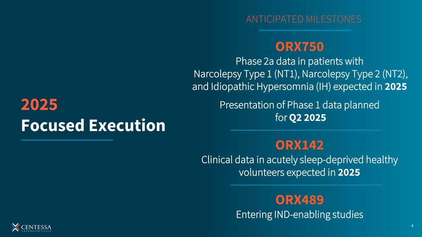 3 Discovering and Developing Transformational Medicines for Patients OUR MISSION Centessa reported $518.4 million in cash, cash equivalents and short-term investments as of September 30, 2024. Cash runway estimated into mid-2027. Potential best-in-class / first-in-class orexin receptor 2 (OX2R) agonist franchise Robust series of clinical milestones anticipated across OX2R agonist pipeline in 2025 Strong balance sheet