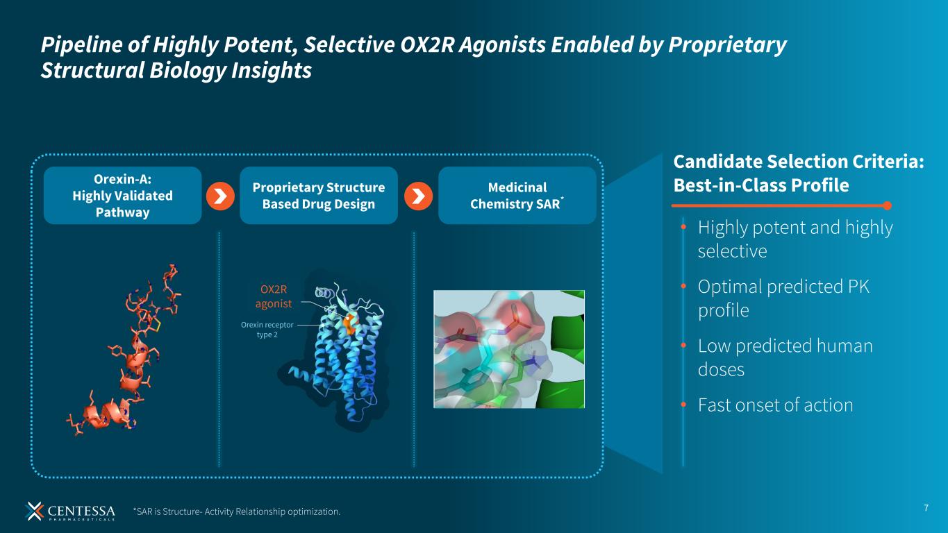 Orexin System is Implicated in Numerous Therapeutic Areas Orexin: a key signaling neuropeptide triggering a cascade of neurotransmitter release 6 Wakefulness Cognition Orexin (hypothalamus) Dopamine (Ventral tegmental area) Serotonin (Raphe nuclei) Acetylcholine (Basal forebrain) Sources: Pizza, F et al., J Sleep Res 2022;31(4):e13665; Toor, B et al., Front Neurol Neurosci 2021;45:38 ; Ten-Blanco, M et al., Front Neuroendo 2023;69:101066; and, Yamamoto, H et al., PLoS One, 2022;17(7):e0271901. Norepinephrine (Locus coeruleus) Histamine (Tuberomammillary nucleus) Attention Mood