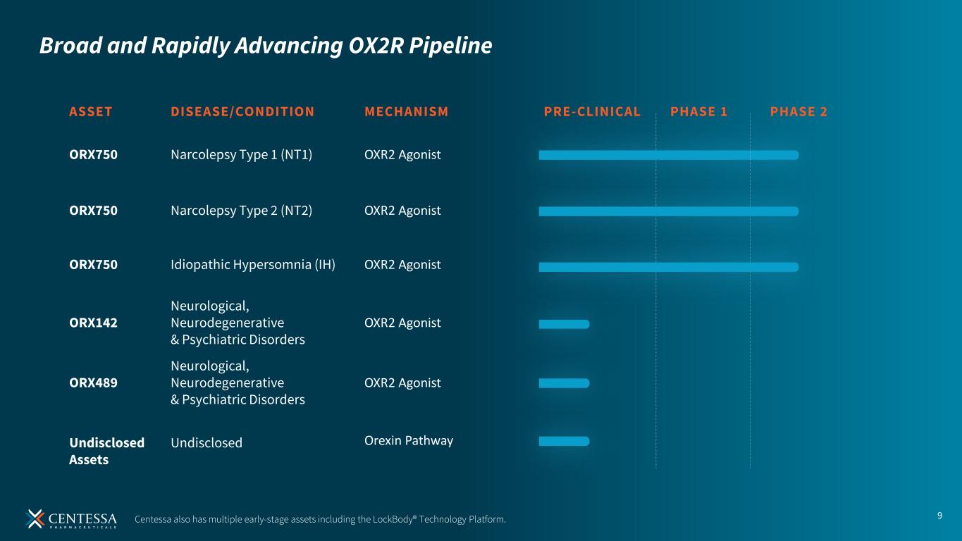 Positioned to be Potential Best-in-Class / First-in-Class in Emerging Category of OX2R Agonist Therapeutics ORX750 for the treatment of NT1, NT2 and IH ORX142 for the treatment of neurological, neurodegenerative and psychiatric disorders Earlier stage OX2R agonists and therapeutics for additional potential indications ORX489 for the treatment of additional neurological, neurodegenerative and psychiatric disorders Molecule hOX2R EC50 (nM) Selectivity vs. hOX1R Native ligand orexin-A (OXA)1 0.035 n/a ORX7501 0.110 9,800x ORX1422 0.069 13,000x ORX4893 0.035 8,800x Fluorescent imaging plate reader (FLIPR) assay with Chinese hamster ovary (CHO) cells stably expressing human recombinant OX1R or OX2R. 1. Black et al., World Sleep 2023 Abstract. 2. Black et al., European Sleep Research Society 2024 Abstract. 3. Company data / presentations. 8