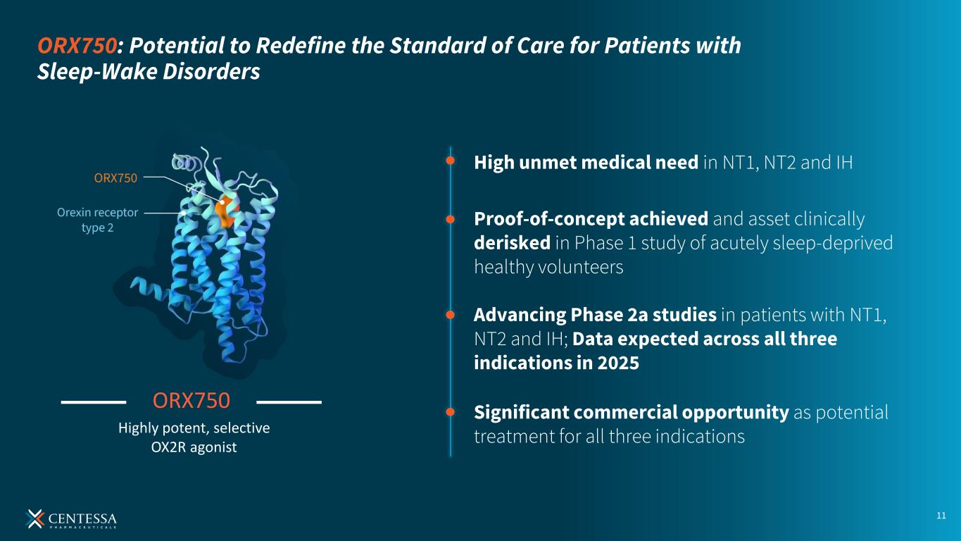Source: Evaluate Pharma 2030 projected sales for narcolepsy – sales are not risk adjusted; projections for other disorders based on internal market research. Potential $15B+ Market Opportunity Across Multiple Therapeutic Areas Sleep-Wake Disorders NT1, NT2, IH $5B+ potential market size Additional Opportunity in Cognition, Attention, and Mood Neurological, Neurodegenerative and Psychiatric Disorders Excessive Daytime Sleepiness and Fatigue Neurological, Neurodegenerative and Psychiatric Disorders $10B+ potential market size 10