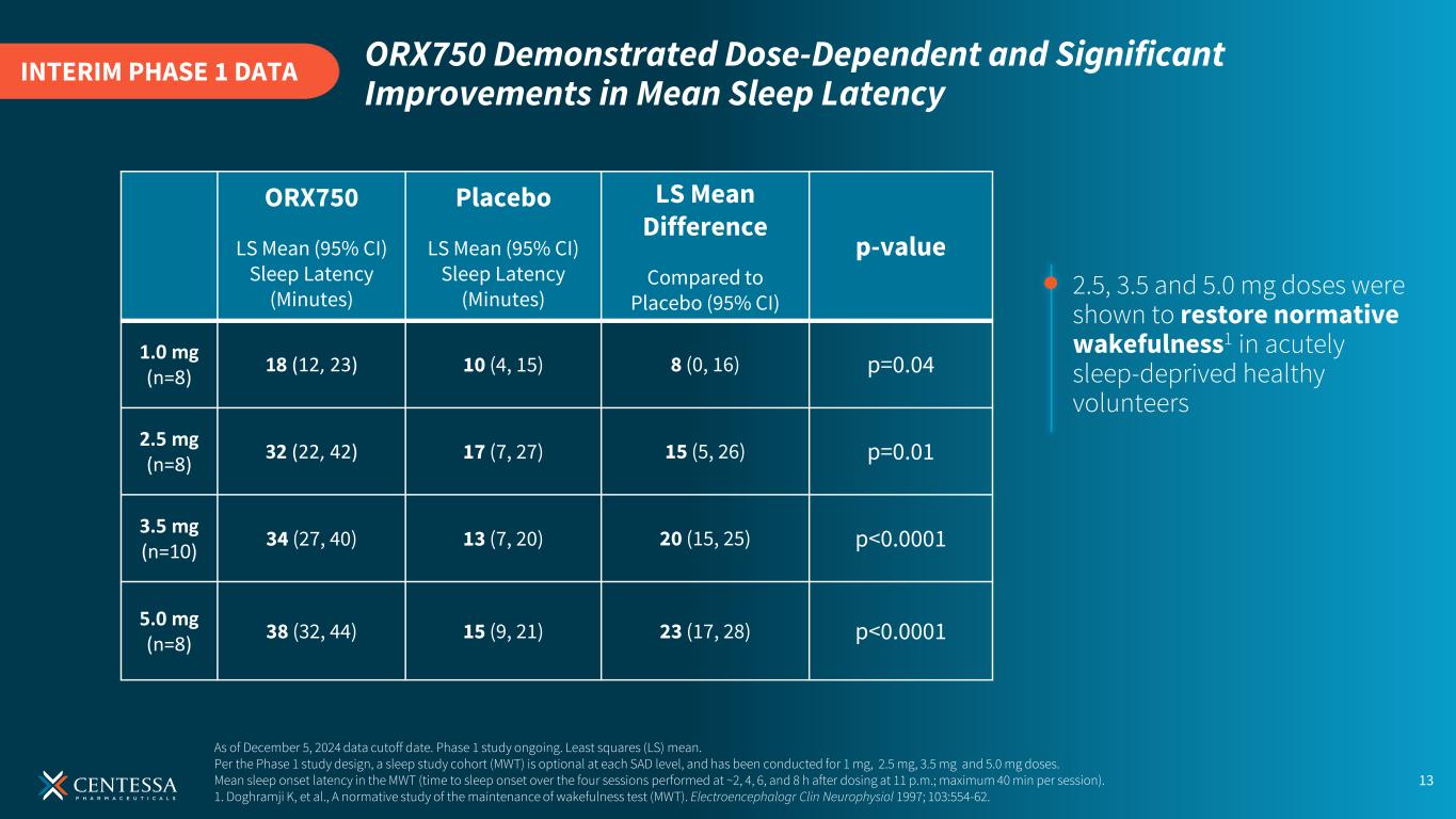ORX750 Phase 1 Interim Data Supports Potential Best-in-Class Profile for the Treatment of NT1, NT2 and IH Summary of Interim Phase 1 Data *MWT is an established registrational and objective endpoint in EDS in sleep-wake disorders. The Phase 1 clinical study of ORX750 evaluates the safety, tolerability and pharmacokinetics (PK) of single-ascending and multiple-ascending doses (SAD and MAD) in healthy adult subjects. In parallel, efficacy assessments are being performed using the Maintenance of Wakefulness Test (MWT)* and Karolinska Sleepiness Scale (KSS) in acutely sleep-deprived healthy adult subjects . Phase 1 Clinical Study Design Favorable safety and tolerability profile;2 No observations of hepatotoxicity, cardiotoxicity, visual disturbances or hallucinations2 Phase 1 study ongoing. 1. Doghramji K, et al., “A normative study of the maintenance of wakefulness test (MWT).” Electroencephalogr Clin Neurophysiol 1997; 103:554-62. 2. Interim Phase 1 study data as of Dec. 5, 2024 data cutoff date. Linear PK profile supports once-daily, oral dosing with rapid absorption2 Shown to restore normative wakefulness1 at low doses in acutely sleep-deprived healthy volunteers2 INTERIM PHASE 1 DATA 12