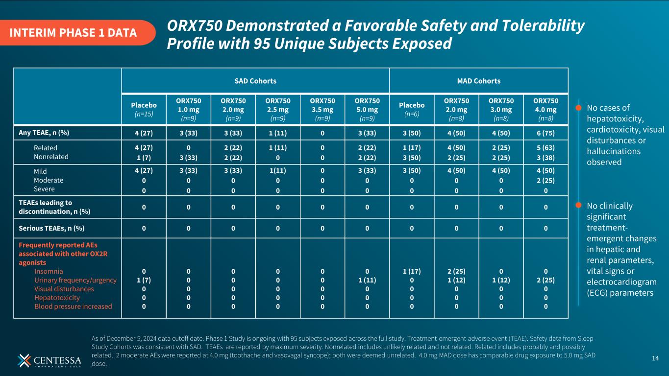 ORX750 Demonstrated Dose-Dependent and Significant Improvements in Mean Sleep Latency ORX750 LS Mean (95% CI) Sleep Latency (Minutes) Placebo LS Mean (95% CI) Sleep Latency (Minutes) LS Mean Difference Compared to Placebo (95% CI) p-value 1.0 mg (n=8) 18 (12, 23) 10 (4, 15) 8 (0, 16) p=0.04 2.5 mg (n=8) 32 (22, 42) 17 (7, 27) 15 (5, 26) p=0.01 3.5 mg (n=10) 34 (27, 40) 13 (7, 20) 20 (15, 25) p<0.0001 5.0 mg (n=8) 38 (32, 44) 15 (9, 21) 23 (17, 28) p<0.0001 2.5, 3.5 and 5.0 mg doses were shown to restore normative wakefulness1 in acutely sleep-deprived healthy volunteers INTERIM PHASE 1 DATA 13 As of December 5, 2024 data cutoff date. Phase 1 study ongoing. Least squares (LS) mean. Per the Phase 1 study design, a sleep study cohort (MWT) is optional at each SAD level, and has been conducted for 1 mg, 2.5 mg, 3.5 mg and 5.0 mg doses. Mean sleep onset latency in the MWT (time to sleep onset over the four sessions performed at ~2, 4, 6, and 8 h after dosing at 11 p.m.; maximum 40 min per session). 1. Doghramji K, et al., A normative study of the maintenance of wakefulness test (MWT). Electroencephalogr Clin Neurophysiol 1997; 103:554-62.