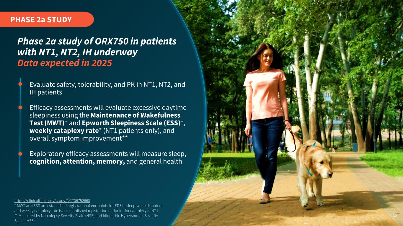 SAD Cohorts MAD Cohorts Placebo (n=15) ORX750 1.0 mg (n=9) ORX750 2.0 mg (n=9) ORX750 2.5 mg (n=9) ORX750 3.5 mg (n=9) ORX750 5.0 mg (n=9) Placebo (n=6) ORX750 2.0 mg (n=8) ORX750 3.0 mg (n=8) ORX750 4.0 mg (n=8) Any TEAE, n (%) 4 (27) 3 (33) 3 (33) 1 (11) 0 3 (33) 3 (50) 4 (50) 4 (50) 6 (75) Related Nonrelated 4 (27) 1 (7) 0 3 (33) 2 (22) 2 (22) 1 (11) 0 0 0 2 (22) 2 (22) 1 (17) 3 (50) 4 (50) 2 (25) 2 (25) 2 (25) 5 (63) 3 (38) Mild Moderate Severe 4 (27) 0 0 3 (33) 0 0 3 (33) 0 0 1(11) 0 0 0 0 0 3 (33) 0 0 3 (50) 0 0 4 (50) 0 0 4 (50) 0 0 4 (50) 2 (25) 0 TEAEs leading to discontinuation, n (%) 0 0 0 0 0 0 0 0 0 0 Serious TEAEs, n (%) 0 0 0 0 0 0 0 0 0 0 Frequently reported AEs associated with other OX2R agonists Insomnia Urinary frequency/urgency Visual disturbances Hepatotoxicity Blood pressure increased 0 1 (7) 0 0 0 0 0 0 0 0 0 0 0 0 0 0 0 0 0 0 0 0 0 0 0 0 1 (11) 0 0 0 1 (17) 0 0 0 0 2 (25) 1 (12) 0 0 0 0 1 (12) 0 0 0 0 2 (25) 0 0 0 No cases of hepatotoxicity, cardiotoxicity, visual disturbances or hallucinations observed No clinically significant treatment- emergent changes in hepatic and renal parameters, vital signs or electrocardiogram (ECG) parameters INTERIM PHASE 1 DATA 14 As of December 5, 2024 data cutoff date. Phase 1 Study is ongoing with 95 subjects exposed across the full study. Treatment-emergent adverse event (TEAE). Safety data from Sleep Study Cohorts was consistent with SAD. TEAEs are reported by maximum severity. Nonrelated includes unlikely related and not related. Related includes probably and possibly related. 2 moderate AEs were reported at 4.0 mg (toothache and vasovagal syncope); both were deemed unrelated. 4.0 mg MAD dose has comparable drug exposure to 5.0 mg SAD dose. ORX750 Demonstrated a Favorable Safety and Tolerability Profile with 95 Unique Subjects Exposed