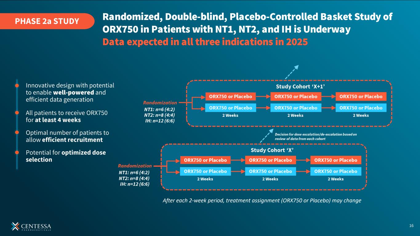 PHASE 2a STUDY Phase 2a study of ORX750 in patients with NT1, NT2, IH underway Data expected in 2025 Evaluate safety, tolerability, and PK in NT1, NT2, and IH patients Efficacy assessments will evaluate excessive daytime sleepiness using the Maintenance of Wakefulness Test (MWT)* and Epworth Sleepiness Scale (ESS)*, weekly cataplexy rate* (NT1 patients only), and overall symptom improvement** Exploratory efficacy assessments will measure sleep, cognition, attention, memory, and general health https://clinicaltrials.gov/study/NCT06752668 * MWT and ESS are established registrational endpoints for EDS in sleep-wake disorders and weekly cataplexy rate is an established registration endpoint for cataplexy in NT1. ** Measured by Narcolepsy Severity Scale (NSS) and Idiopathic Hypersomnia Severity Scale (IHSS). 15
