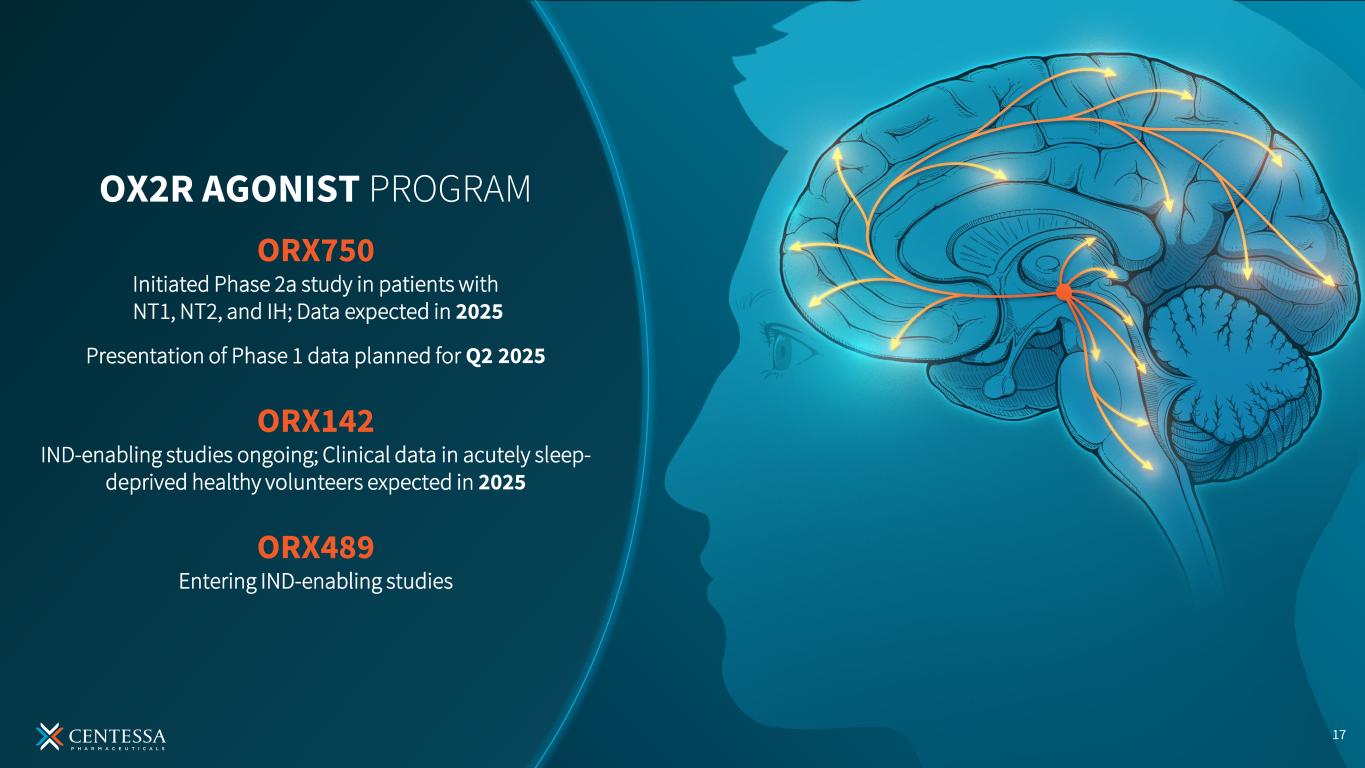 PHASE 2a STUDY Randomized, Double-blind, Placebo-Controlled Basket Study of ORX750 in Patients with NT1, NT2, and IH is Underway Data expected in all three indications in 2025 Innovative design with potential to enable well-powered and efficient data generation All patients to receive ORX750 for at least 4 weeks Optimal number of patients to allow efficient recruitment Potential for optimized dose selection 16