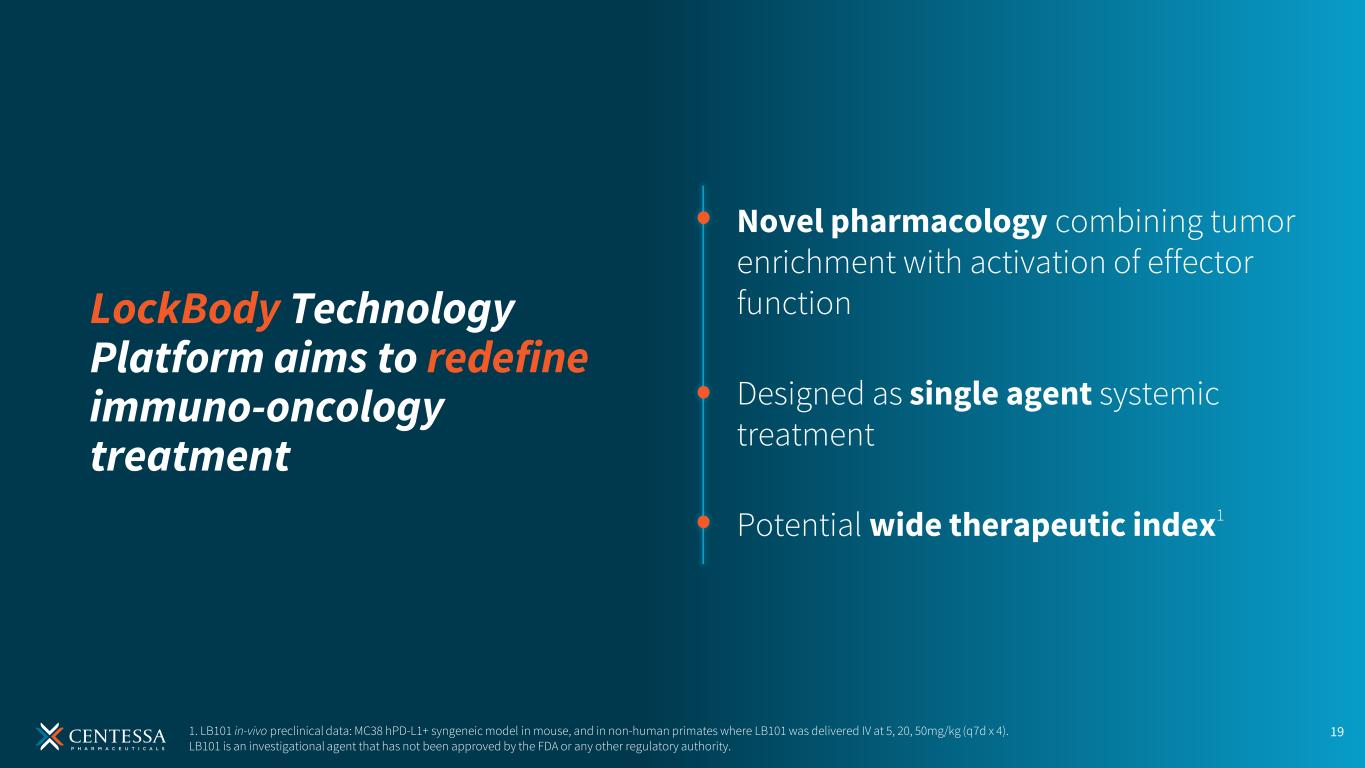 LockBody Technology Platform aims to redefine immuno-oncology treatment Novel pharmacology combining tumor enrichment with activation of effector function Designed as single agent systemic treatment Potential wide therapeutic index1 1. LB101 in-vivo preclinical data: MC38 hPD-L1+ syngeneic model in mouse, and in non-human primates where LB101 was delivered IV at 5, 20, 50mg/kg (q7d x 4). LB101 is an investigational agent that has not been approved by the FDA or any other regulatory authority. 19