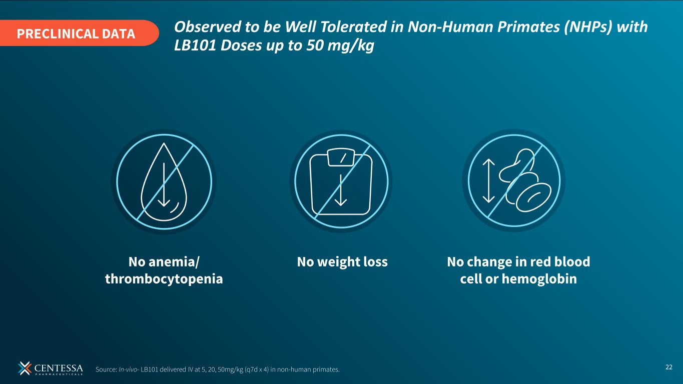 Observed to be Well Tolerated in Non-Human Primates (NHPs) with LB101 Doses up to 50 mg/kg Source: In-vivo- LB101 delivered IV at 5, 20, 50mg/kg (q7d x 4) in non-human primates. No anemia/ thrombocytopenia No weight loss No change in red blood cell or hemoglobin 22 PRECLINICAL DATA