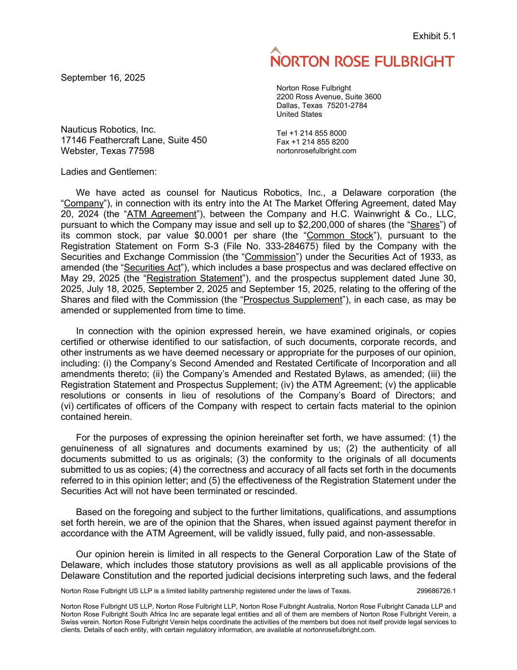 Exhibit 5.1 Norton Rose Fulbright US LLP is a limited liability partnership registered under the laws of Texas. 299686726.1 Norton Rose Fulbright US LLP, Norton Rose Fulbright LLP, Norton Rose Fulbright Australia, Norton Rose Fulbright Canada LLP and Norton Rose Fulbright South Africa Inc are separate legal entities and all of them are members of Norton Rose Fulbright Verein, a Swiss verein. Norton Rose Fulbright Verein helps coordinate the activities of the members but does not itself provide legal services to clients. Details of each entity, with certain regulatory information, are available at nortonrosefulbright.com. Norton Rose Fulbright 2200 Ross Avenue, Suite 3600 Dallas, Texas 75201-2784 United States Tel +1 214 855 8000 Fax +1 214 855 8200 nortonrosefulbright.com September 16, 2025 Nauticus Robotics, Inc. 17146 Feathercraft Lane, Suite 450 Webster, Texas 77598 Ladies and Gentlemen: We have acted as counsel for Nauticus Robotics, Inc., a Delaware corporation (the “Company”), in connection with its entry into the At The Market Offering Agreement, dated May 20, 2024 (the “ATM Agreement”), between the Company and H.C. Wainwright & Co., LLC, pursuant to which the Company may issue and sell up to $2,200,000 of shares (the “Shares”) of its common stock, par value $0.0001 per share (the “Common Stock”), pursuant to the Registration Statement on Form S-3 (File No. 333-284675) filed by the Company with the Securities and Exchange Commission (the “Commission”) under the Securities Act of 1933, as amended (the “Securities Act”), which includes a base prospectus and was declared effective on May 29, 2025 (the “Registration Statement”), and the prospectus supplement dated June 30, 2025, July 18, 2025, September 2, 2025 and September 15, 2025, relating to the offering of the Shares and filed with the Commission (the “Prospectus Supplement”), in each case, as may be amended or supplemented from time to time. In connection with the opinion expressed herein, we have examined originals, or copies certified or otherwise identified to our satisfaction, of such documents, corporate records, and other instruments as we have deemed necessary or appropriate for the purposes of our opinion, including: (i) the Company’s Second Amended and Restated Certificate of Incorporation and all amendments thereto; (ii) the Company’s Amended and Restated Bylaws, as amended; (iii) the Registration Statement and Prospectus Supplement; (iv) the ATM Agreement; (v) the applicable resolutions or consents in lieu of resolutions of the Company’s Board of Directors; and (vi) certificates of officers of the Company with respect to certain facts material to the opinion contained herein. For the purposes of expressing the opinion hereinafter set forth, we have assumed: (1) the genuineness of all signatures and documents examined by us; (2) the authenticity of all documents submitted to us as originals; (3) the conformity to the originals of all documents submitted to us as copies; (4) the correctness and accuracy of all facts set forth in the documents referred to in this opinion letter; and (5) the effectiveness of the Registration Statement under the Securities Act will not have been terminated or rescinded. Based on the foregoing and subject to the further limitations, qualifications, and assumptions set forth herein, we are of the opinion that the Shares, when issued against payment therefor in accordance with the ATM Agreement, will be validly issued, fully paid, and non-assessable. Our opinion herein is limited in all respects to the General Corporation Law of the State of Delaware, which includes those statutory provisions as well as all applicable provisions of the Delaware Constitution and the reported judicial decisions interpreting such laws, and the federal